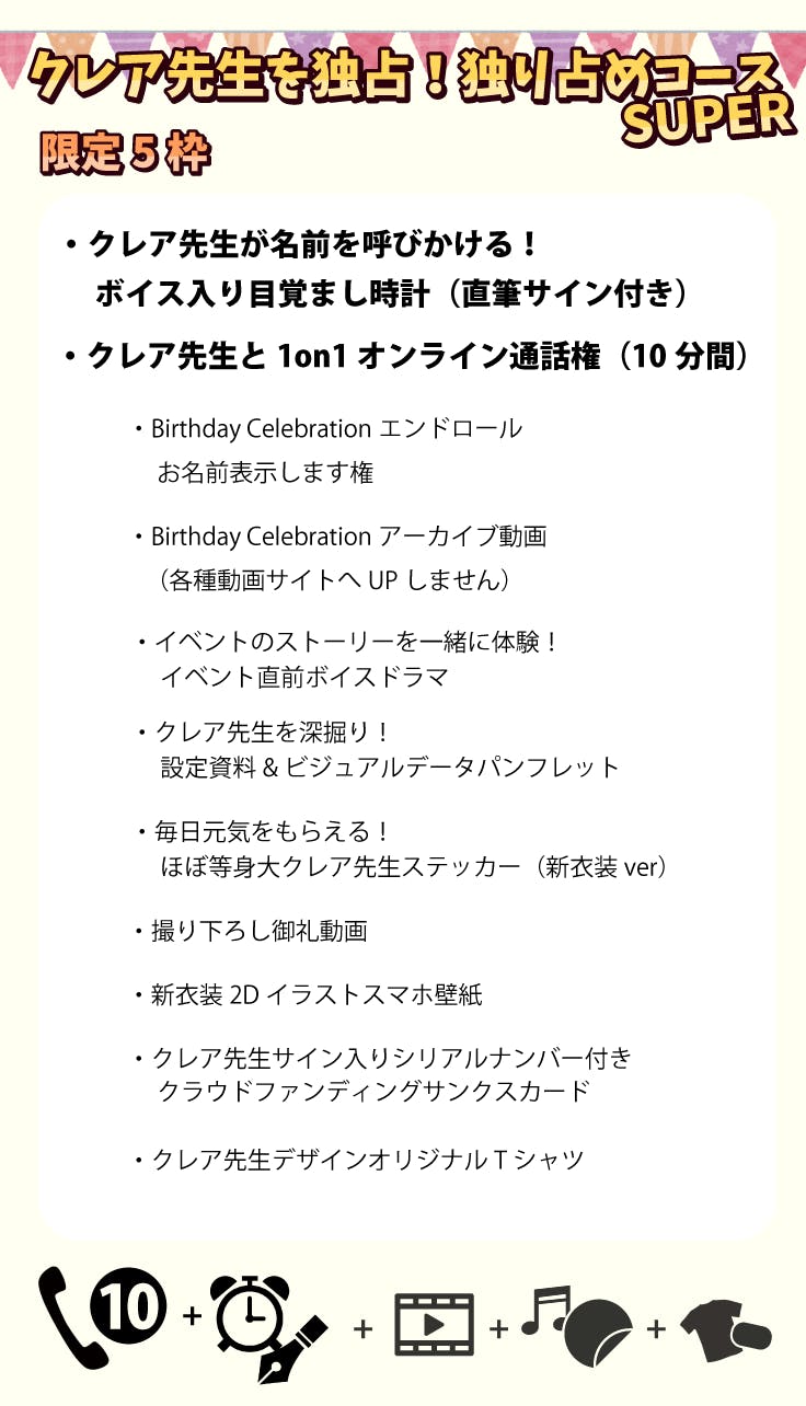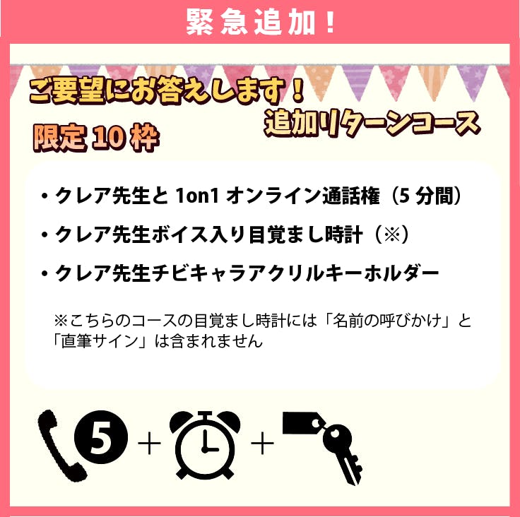 11/10(月)のクレア英会話生放送にて、たくさんのファンの方から追加リターンのご要望をいただきました。それに伴い、新たに限定10枠のコースと数量制限のないコースの2つをご用意しました。どちらにも今までのリターンにはないグッズが含まれています。ストレッチゴール達成に向けて、ファンの皆さんからのご支援よろしくお願いします!