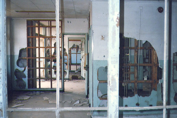 建物内部はこの通り、惨憺たるありさま。同様に米軍基地跡である立川基地(後述)はまだ使える古い建物が残っていたため、その屋内に警備事務所が設置されていたのですが、関東村は全建造物がこのように窓もなく風雨に耐えられない状態だったので、プレファブ事務所設置となりました。電気と電話だけが通じ、水道は敷地内にないため、隊員が各自家からタンクで水を持ち込みました。冬はとてつもなく寒く、夏は恐ろしく暑いその事務所に、警備犬ビコと警備隊員2名は交替で寝泊まりしていたのです。冬はよく風邪をひいたなあ。