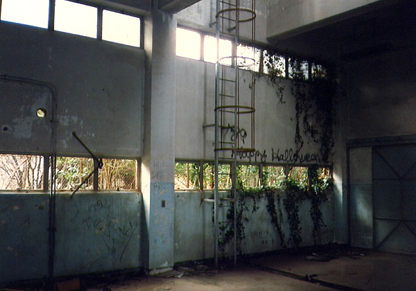 これは関東村に当時残された中で最大の施設、ボイラー工場。中は巨大なボイラーと配管だらけです。左手にこんもりと見えるブッシュ下に隠された貯水槽とこのボイラーが、関東村全域にお湯を給湯していたと思われます。