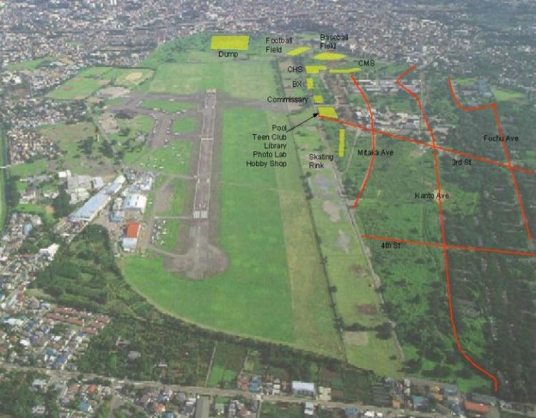 かつての住民が旧施設名を付記した関東村の航空写真。写真は私が働いていた頃のものです。