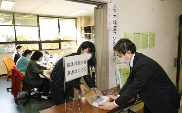 施設側はスマートフォンなどを使って申し込み、同センターで検査キットを受け取る。症状がある人の唾液を施設などで採取し、同センターに提出する。府は21日午前、大阪市中央区のセンターの内部を公開。検査キットの受け渡しをするデモンストレーションを行った。