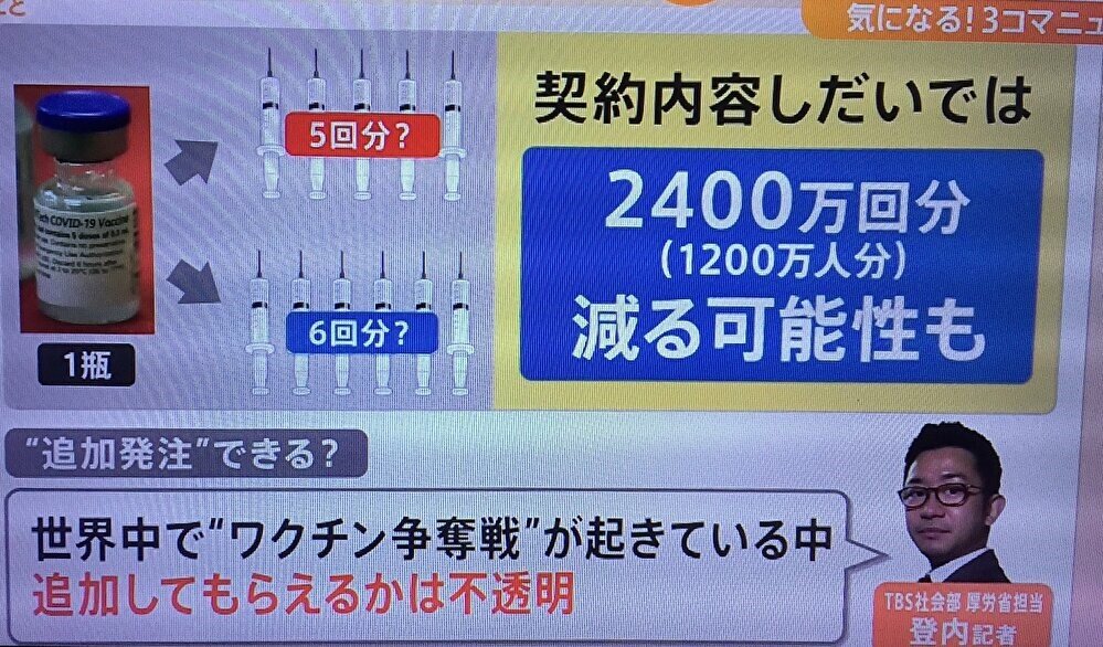 一方、ファイザーは1つの容器で6回の接種を前提にしているため現在、計画されている供給量で接種を受けられる人数は2割近く減る計算になり、供給の時期などに影響が出ることも懸念されます。