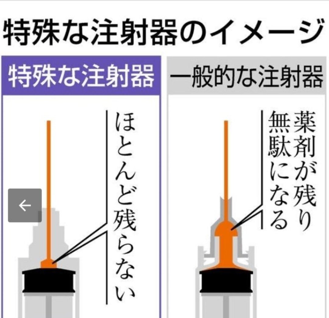 一方、厚生労働省によりますと、日本で一般的に使われている注射器では、注射をした際により多くの薬液が針とシリンジの間に残る構造になっているため、特殊なシリンジを使った場合に比べて必要となる薬液の量が増えるということです。
