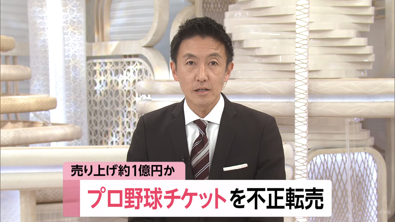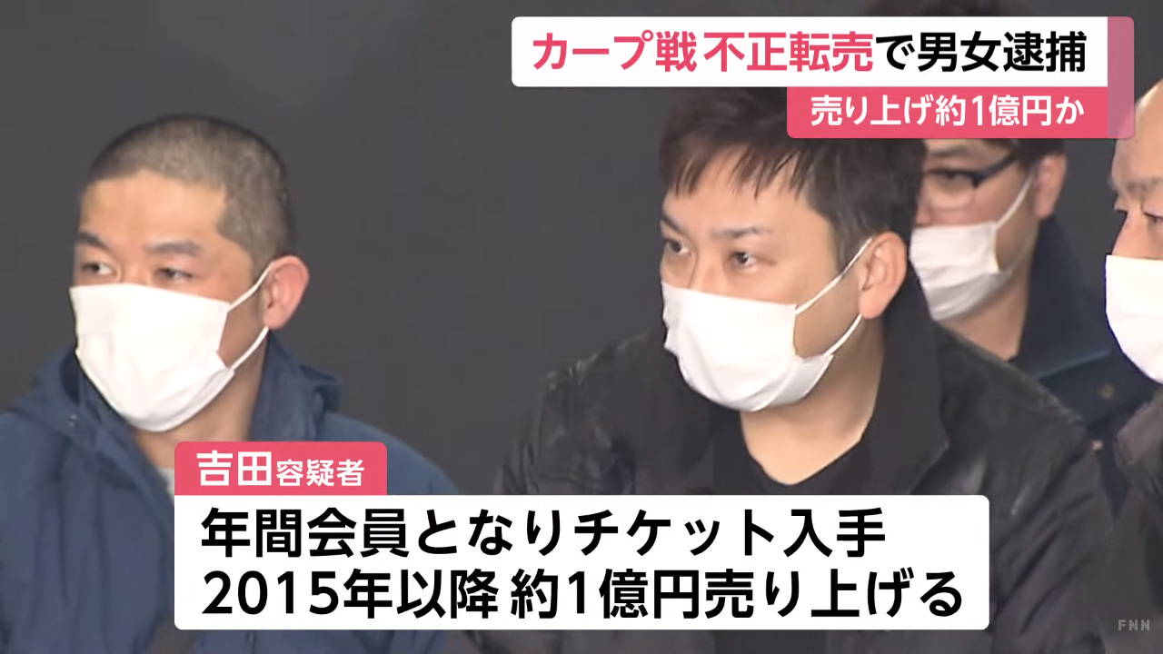 広島カープの年間会員となってチケットを入手し、通常1万3,000円のチケットを6万6,000円で転売するなど、2015年以降およそ1億円を売り上げていたという。
