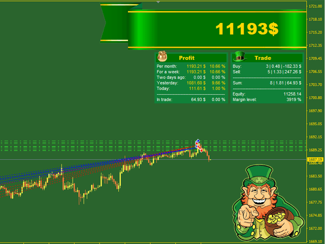 You should avoid the flat market on holidays, evenings, and nights when using Leprechaun or on the American trading session. The Expert Advisor does not use indicators, the only indicator for the robot is the price itself, where the price goes, the robot opens positions there.