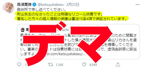 - 高須克弥、「署名の個人情報保護は憲法15条が保障している」と発言するも、デマ。