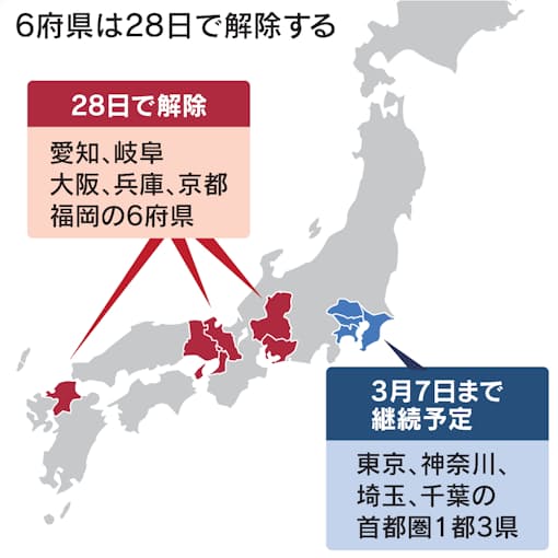 政府は26日、新型コロナウイルス対策で10都府県に発令している緊急事態宣言について、首都圏を除く6府県を28日で解除すると決めた。対象地域は飲食店の営業時間短縮などの感染防止対策を段階的に緩和する。首都圏1都3県は新規感染者数の減少が鈍く、宣言の期限である3月7日で解除できるか慎重に見極める。