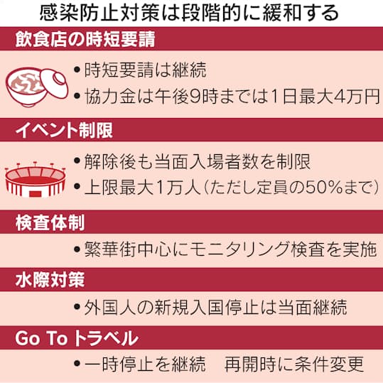 外国人の新規入国のほか中国や韓国など11カ国・地域を対象にしたビジネス往来の停止は宣言解除後も当面の間、維持する。国内外の感染状況を分析し、外国人の新規入国を認めるか協議する。