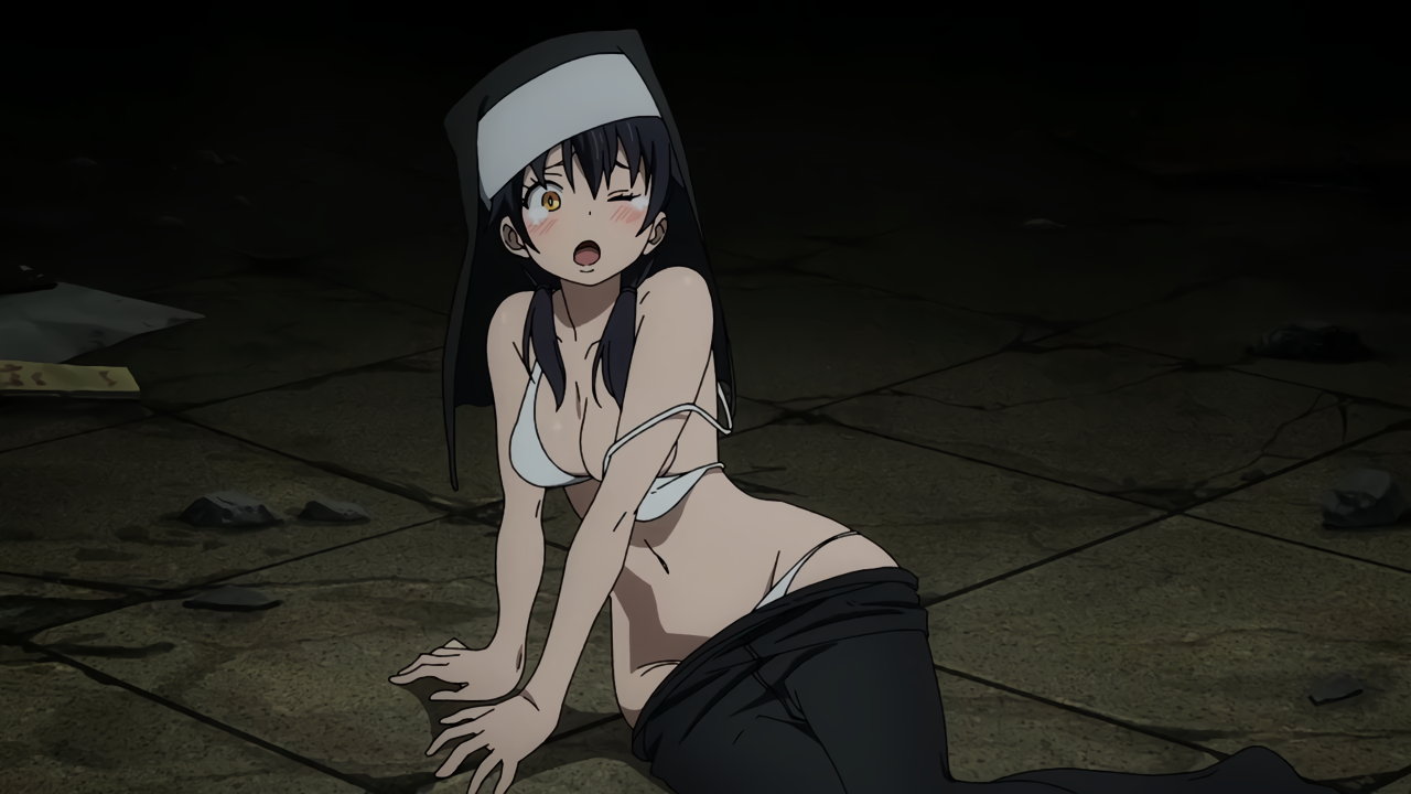 修道服が脱げ、ビキニ水着ベール姿になるシスター環。