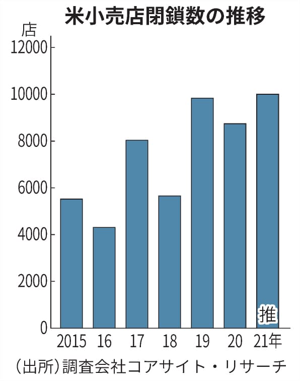 コアサイトは21年の閉店数を1万店と見込み、再び増加すると予測する。経済活動が本格的に再開する中で政府支援策の効果が薄れ、消費者のECシフトが加速するとみている。