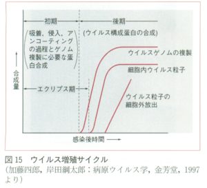 感染細胞内に感染ウイルスが証明されるまでを暗黒期eclipse period、感染後、細胞外にウイルス粒子が証明される期間を潜伏期latent period、急速なウイルス量の増加が起こる時間を増殖期growth periodといいます。