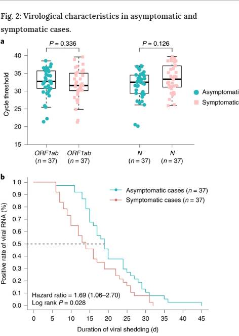 無症候性患者における最初の鼻咽腔スワブ陽性から最後のスワブ陽性までの間隔と定義したウイルス排泄期間の中央値は19日(IQR、15~26日)であった。ウイルス排泄の観察期間が最も短かったのは6日であったが、最も長かったのは45日であった。ウイルス排泄期間の中央値は、症状が軽度の患者では14日(IQR、9~22日)であった。無症候群は、症候群よりもウイルス排泄期間が有意に長かった(log-rank P = 0.028)(図2b)。しかしながら、測定可能なウイルス排泄はウイルス感染能と同等ではなく、培養可能なウイルスと相関する呼吸器SARS-CoV-2ウイルス量を測定するためには更なる評価が必要である11。