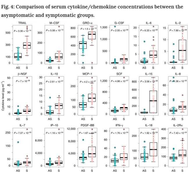 図4:無症候性群と症候性群の血清サイトカイン/ケモカイン濃度の比較。