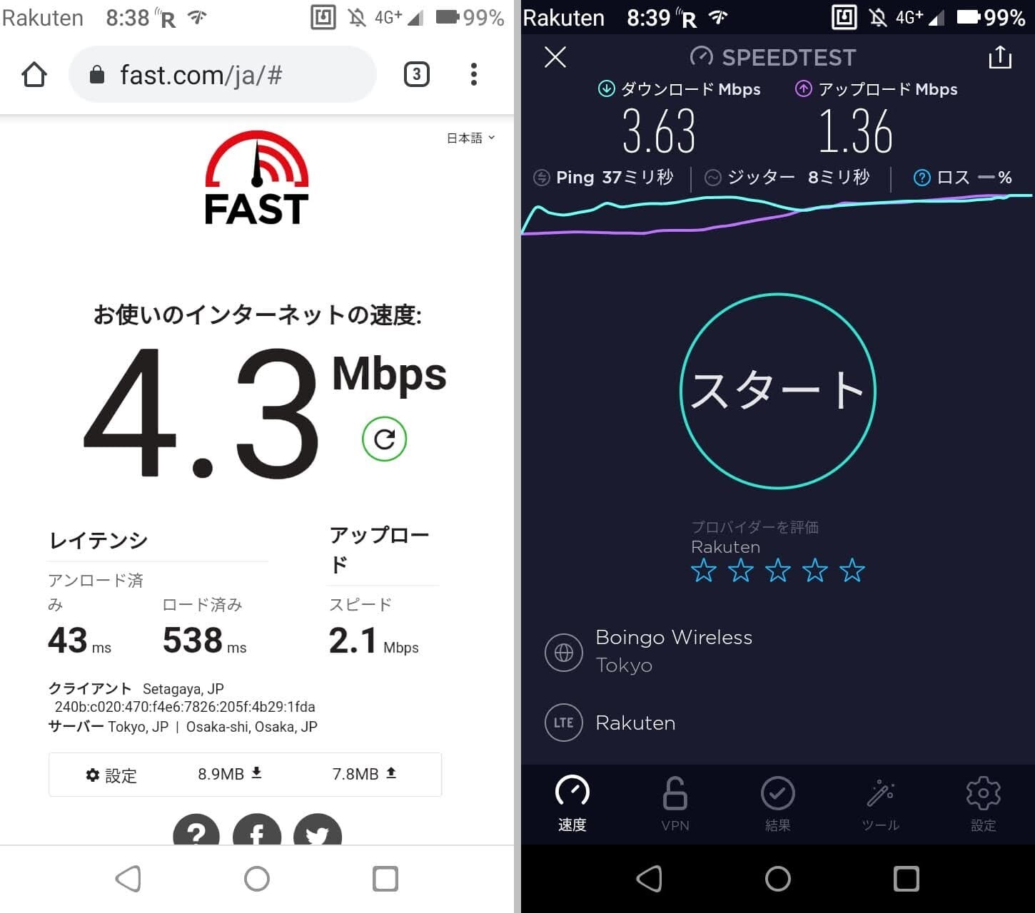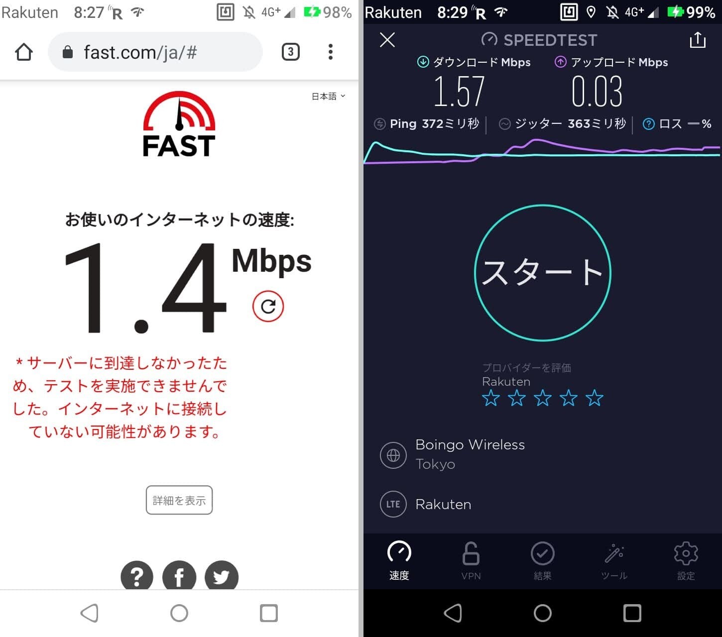Band3に固定して室内でスピードテストを実施。下りは1.4Mbps程度。上りはほぼ計測できないレベルで、Fast.comではエラーとなりました。室内まで電波が浸透せず、ほとんど圏外に近い状態です。