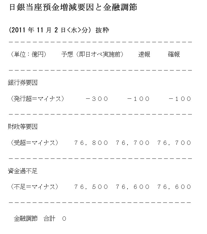 まず、為替相場のスポット取引日は、2営業日後となるため、10月31日の介入額を総計するためには11月2日の日銀当座預金増減要因と金融調節を用いる必要があります。