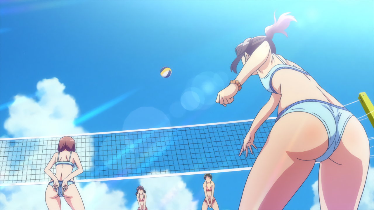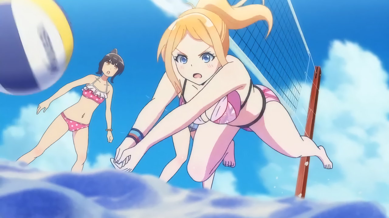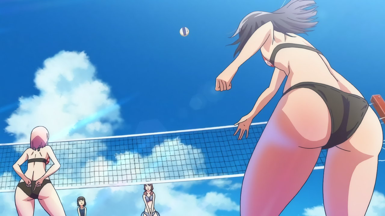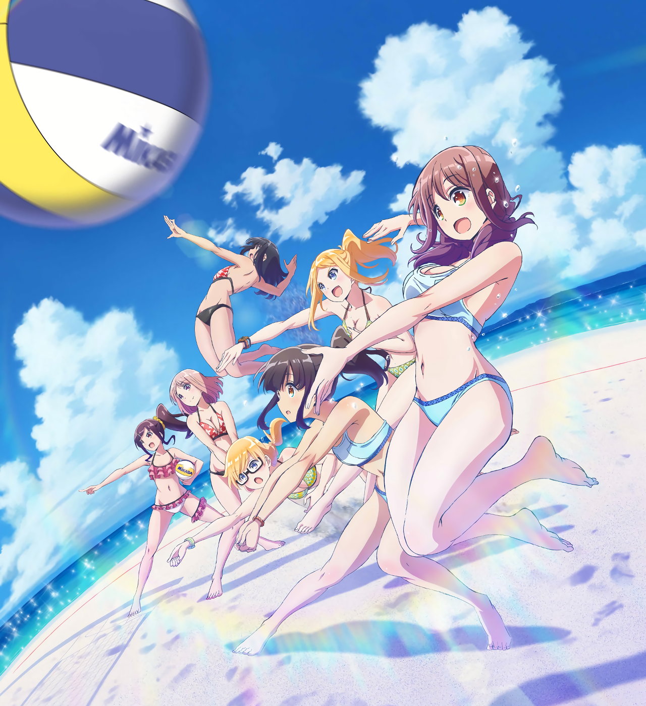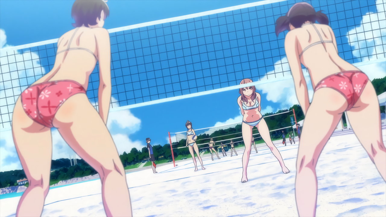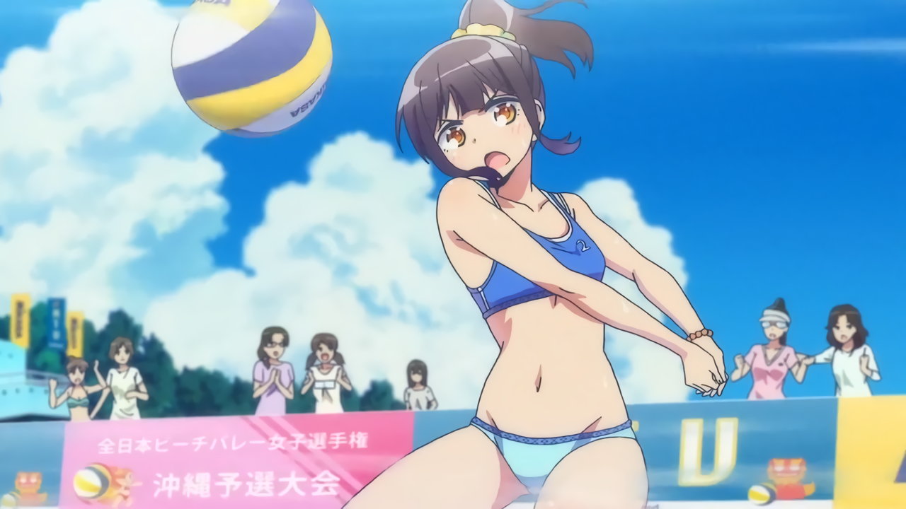 砂浜に集合する、水着姿の女子たち。なお本作品は至極健全な作品だが、ビーチバレーが題材のため常時水着回が続く。