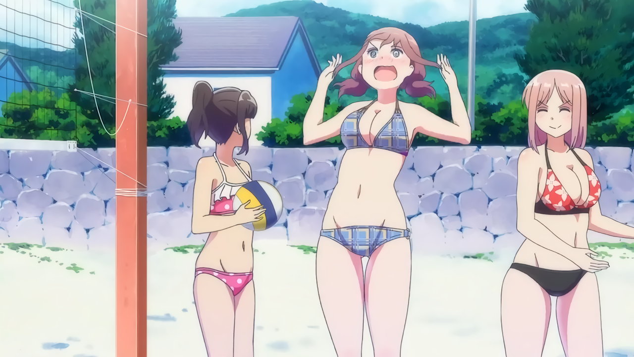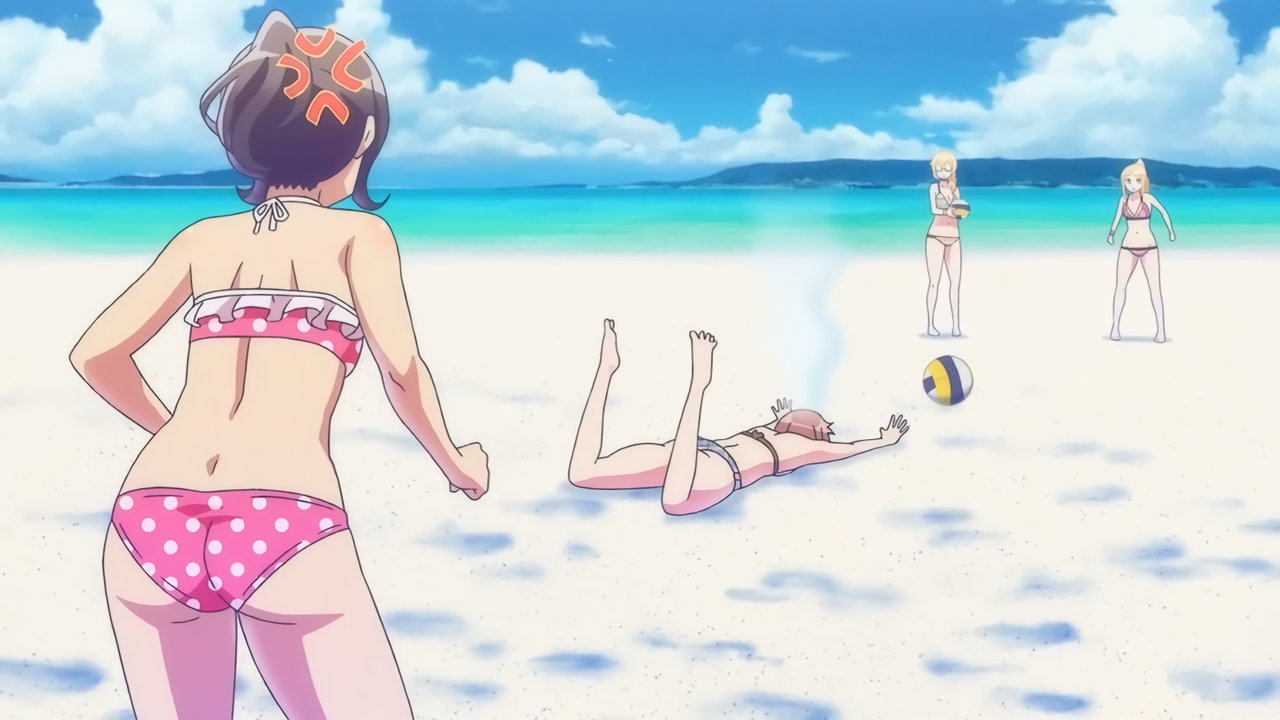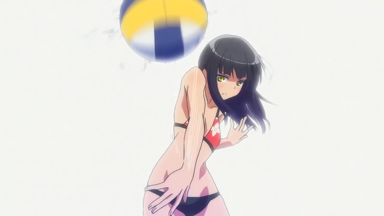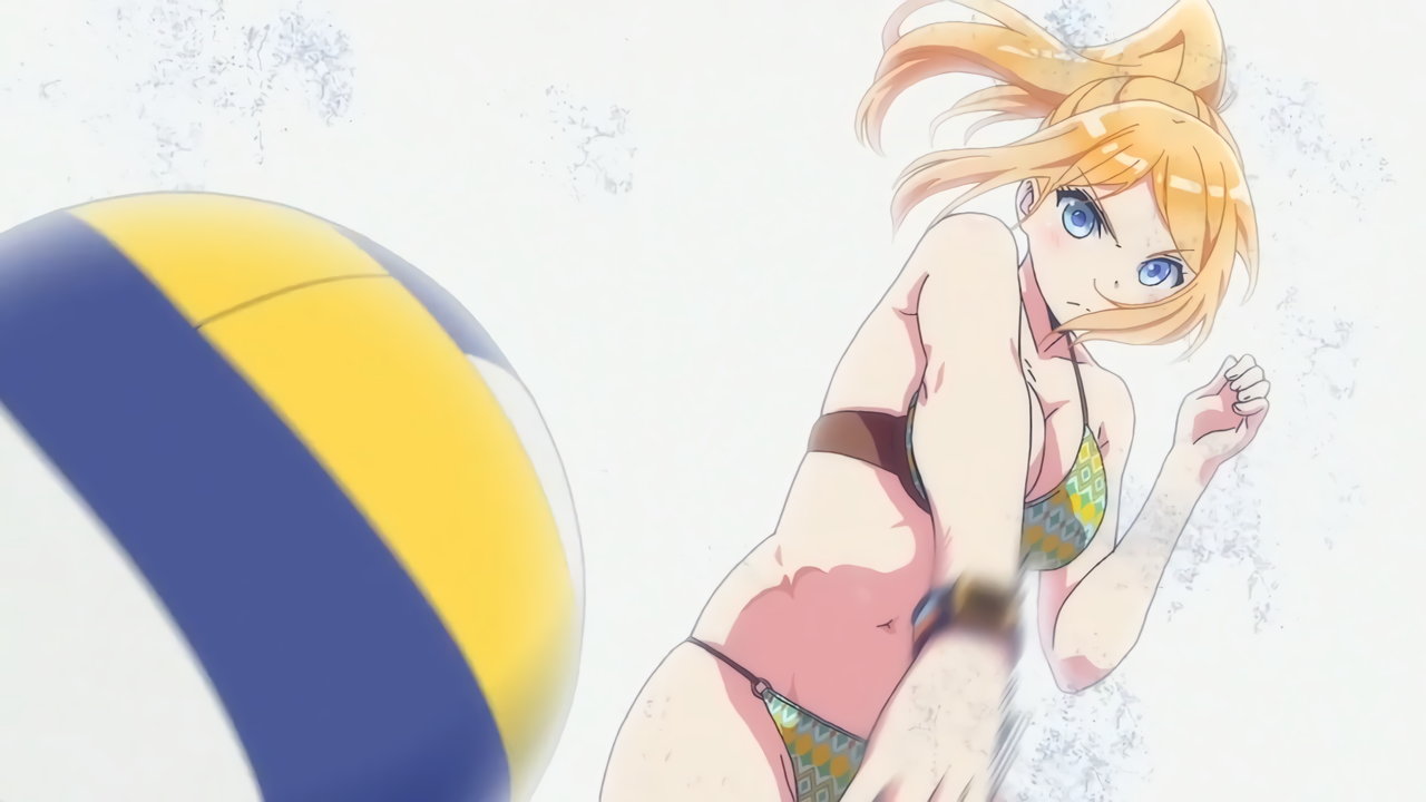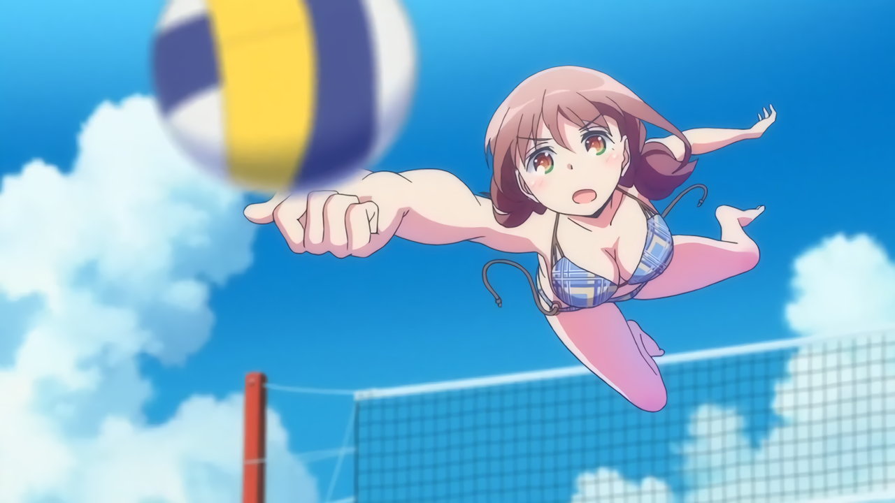 砂浜に集合する、水着姿の女子たち。なお本作品は至極健全な作品だが、ビーチバレーが題材のため常時水着回が続く。