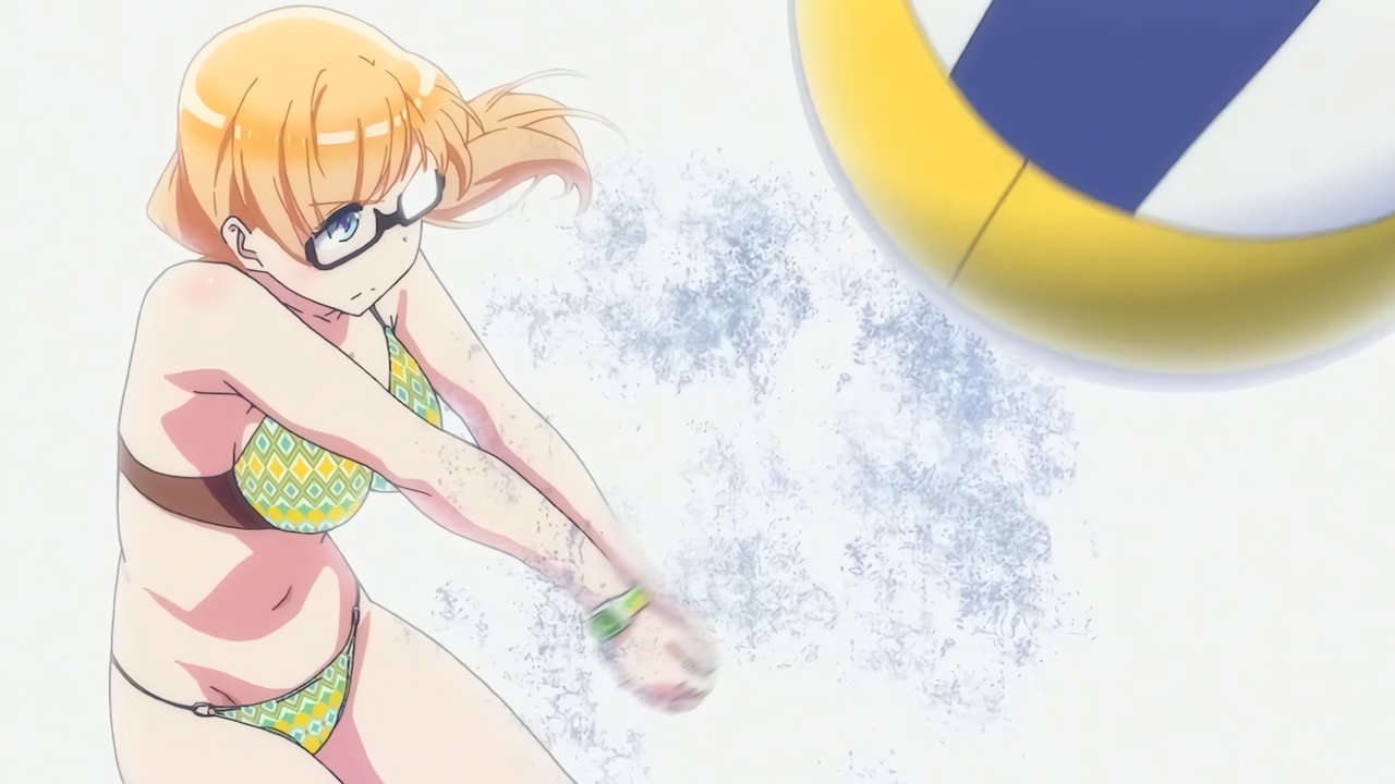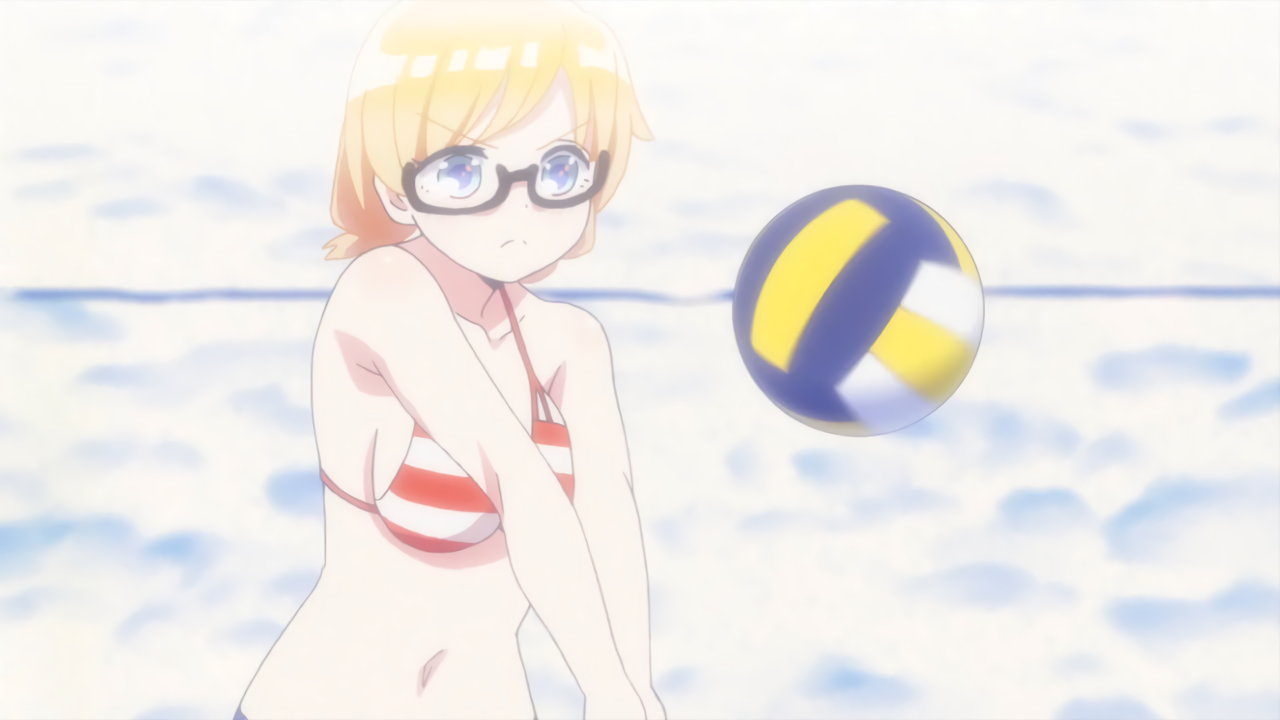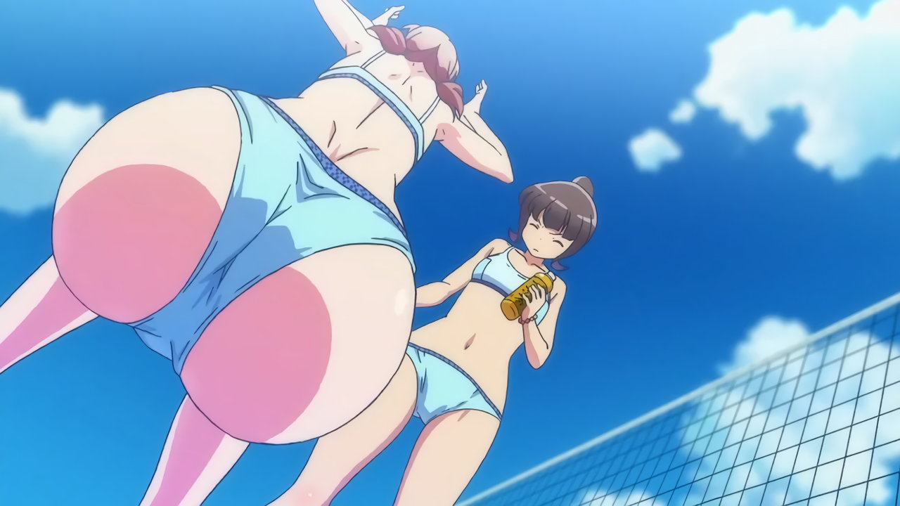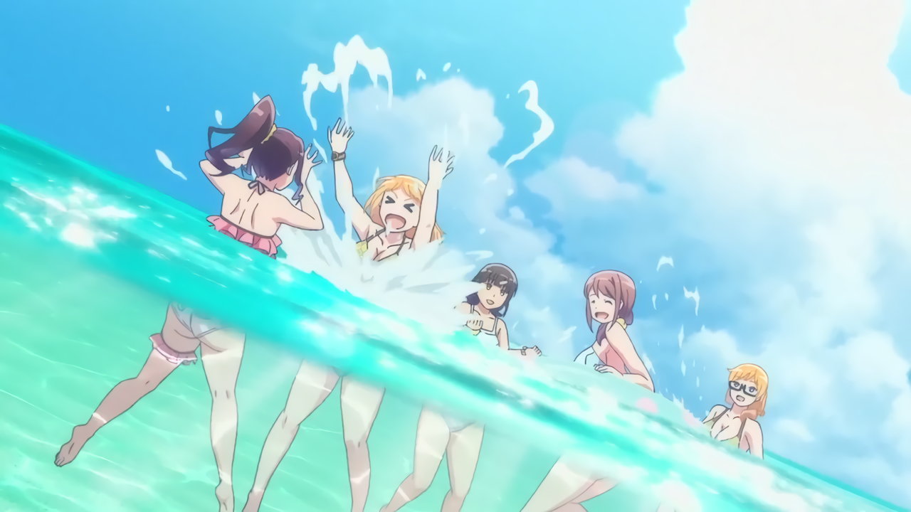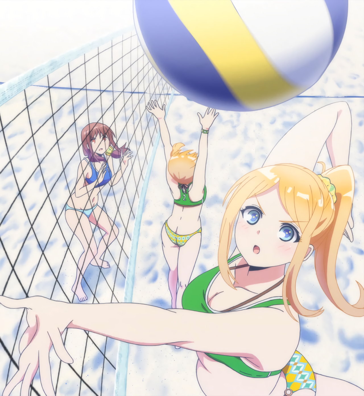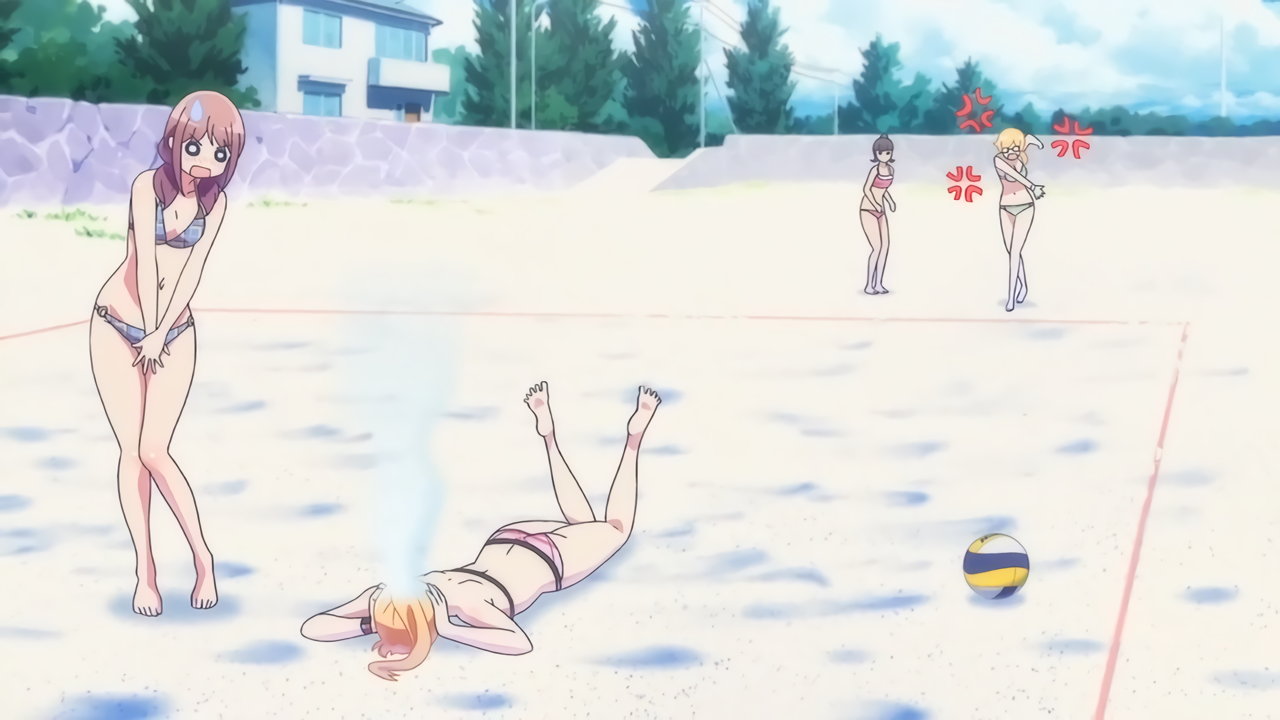 砂浜に集合する、水着姿の女子たち。なお本作品は至極健全な作品だが、ビーチバレーが題材のため常時水着回が続く。