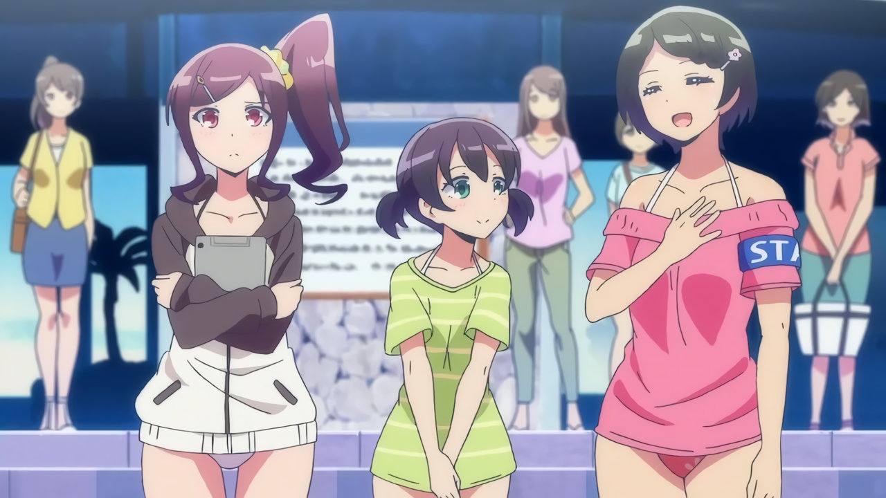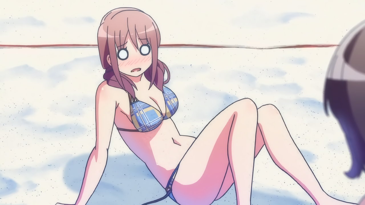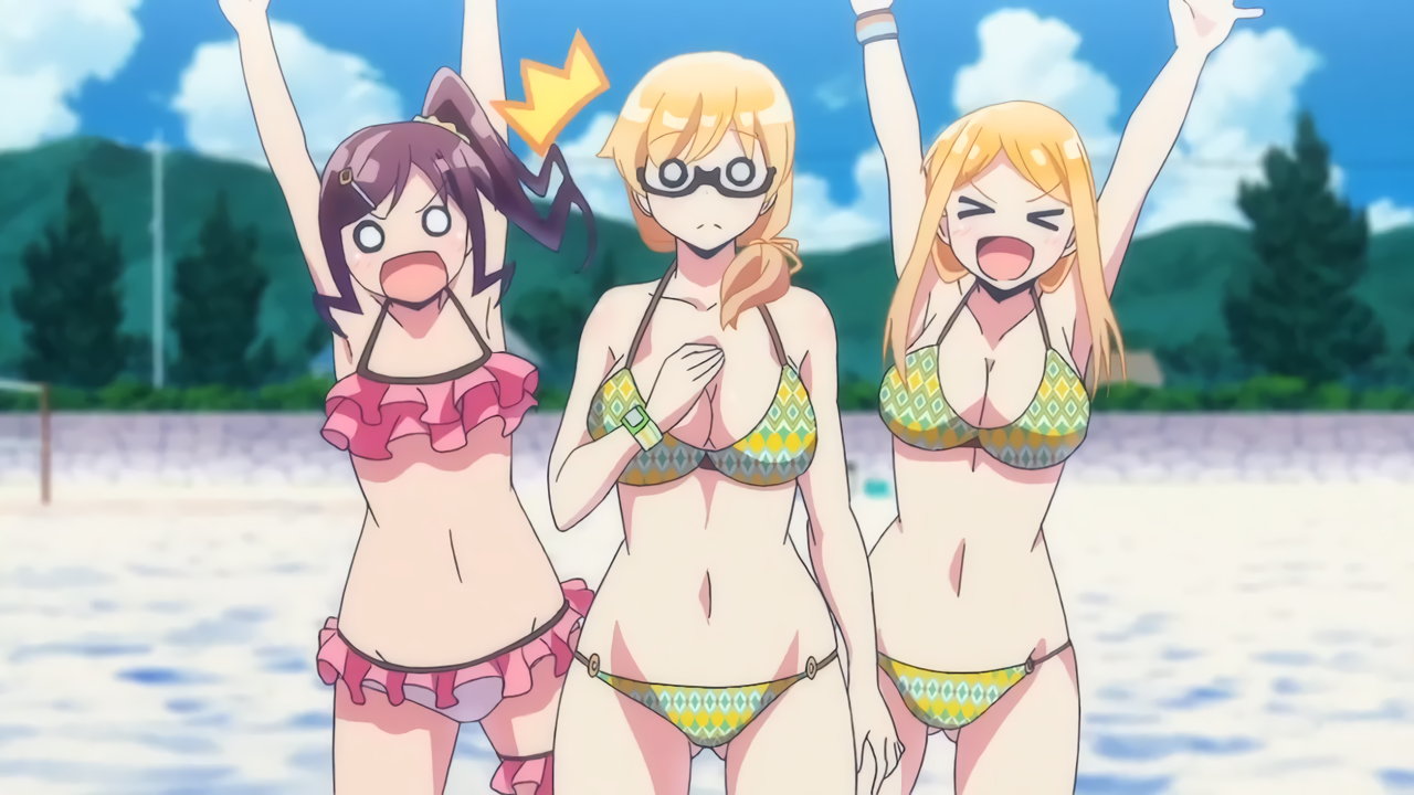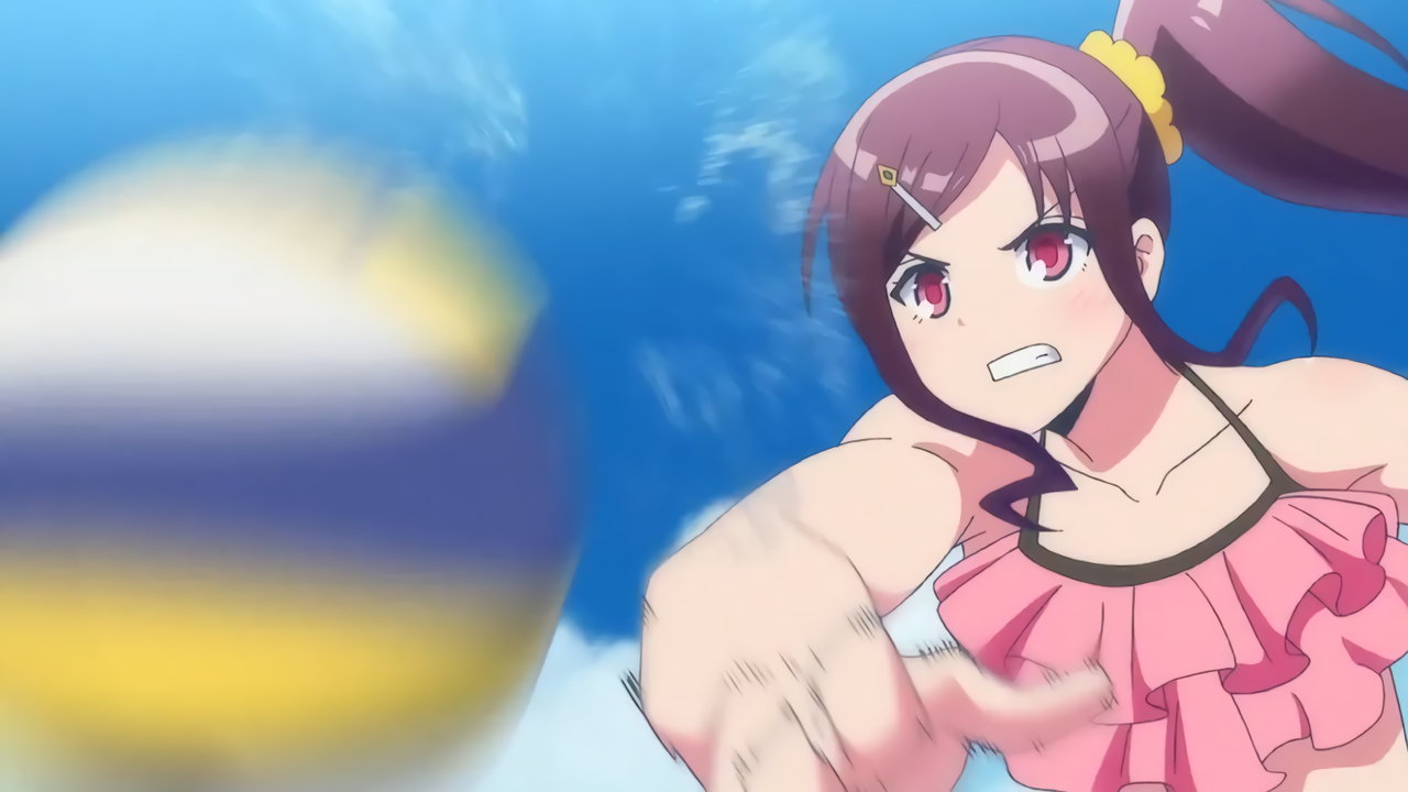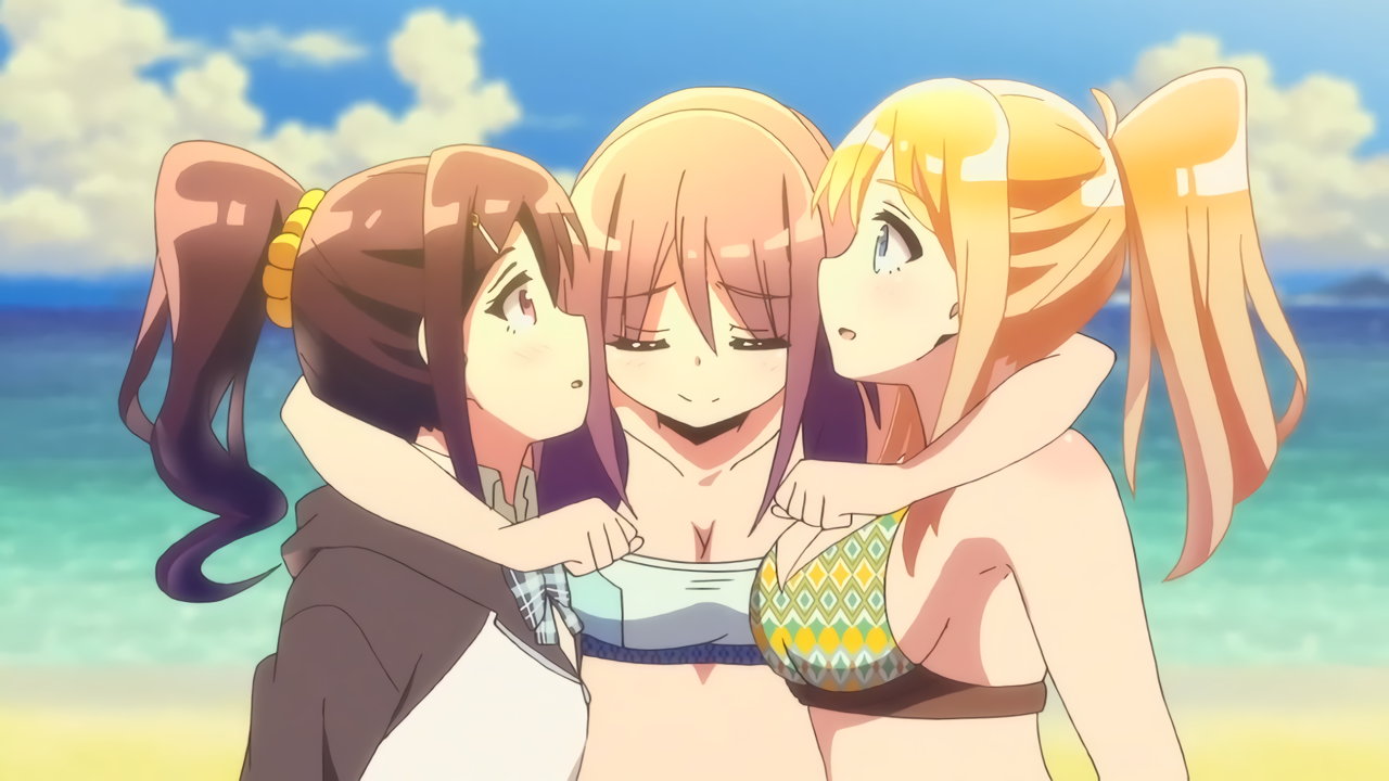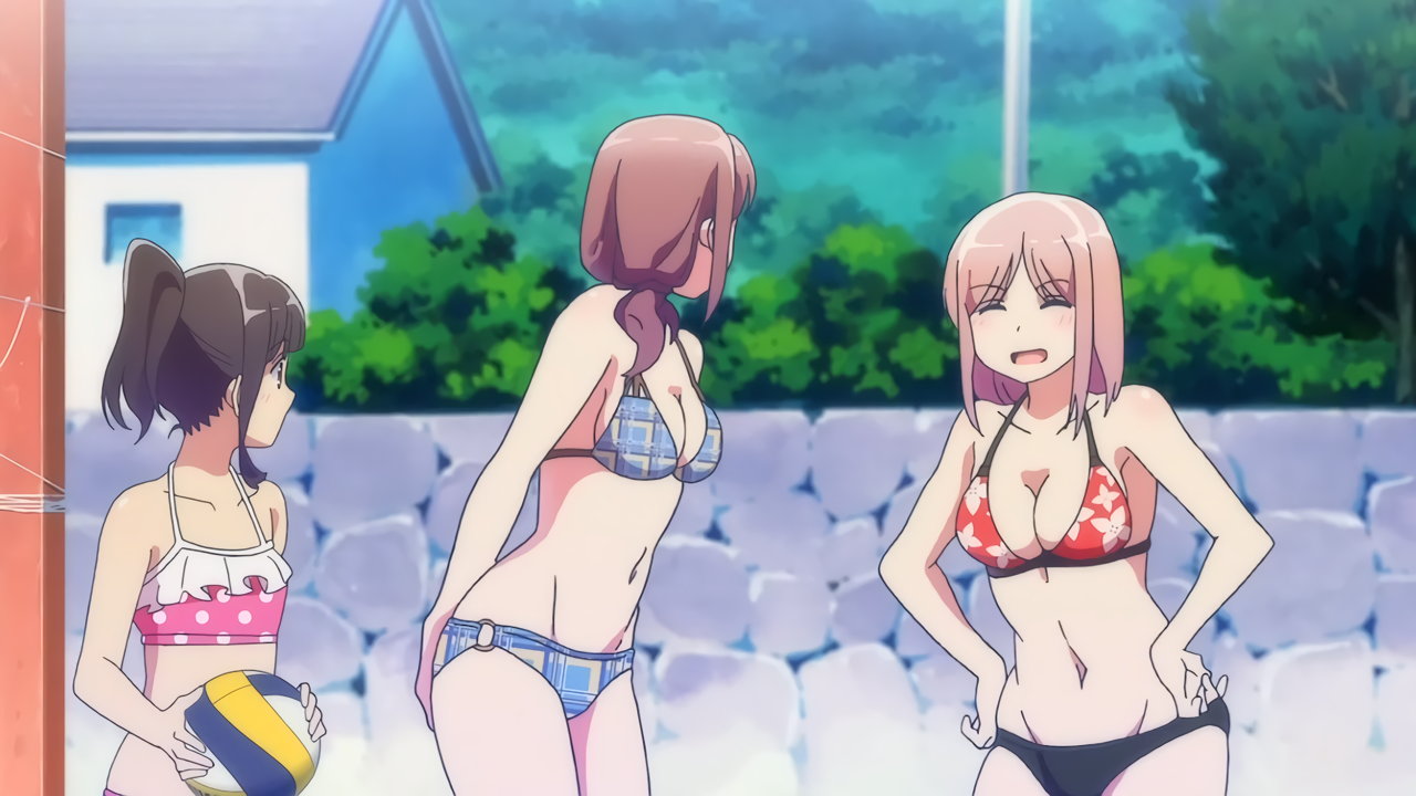 砂浜に集合する、水着姿の女子たち。なお本作品は至極健全な作品だが、ビーチバレーが題材のため常時水着回が続く。