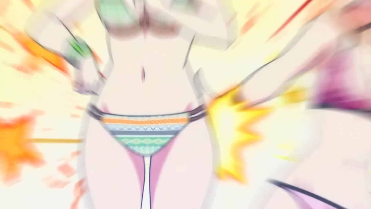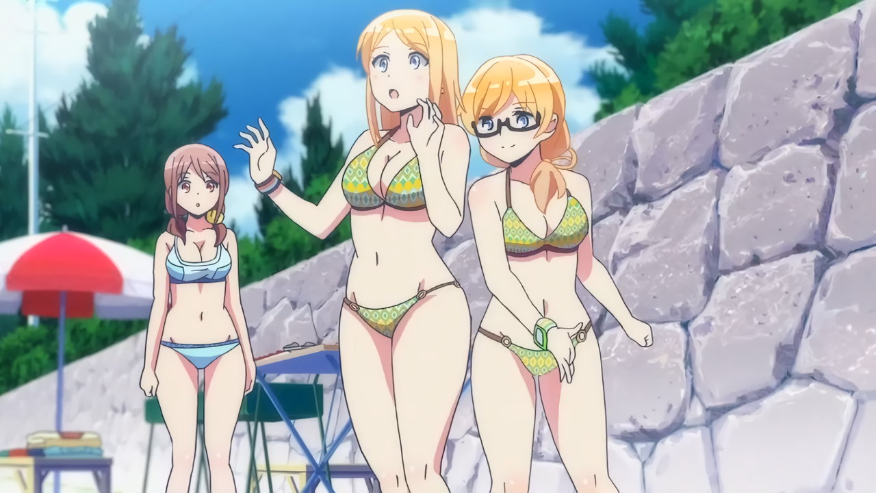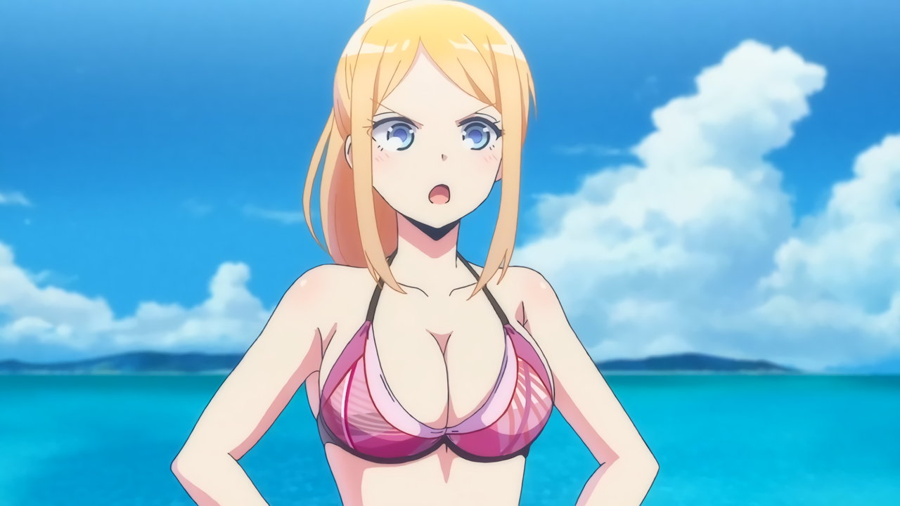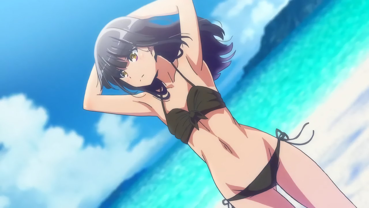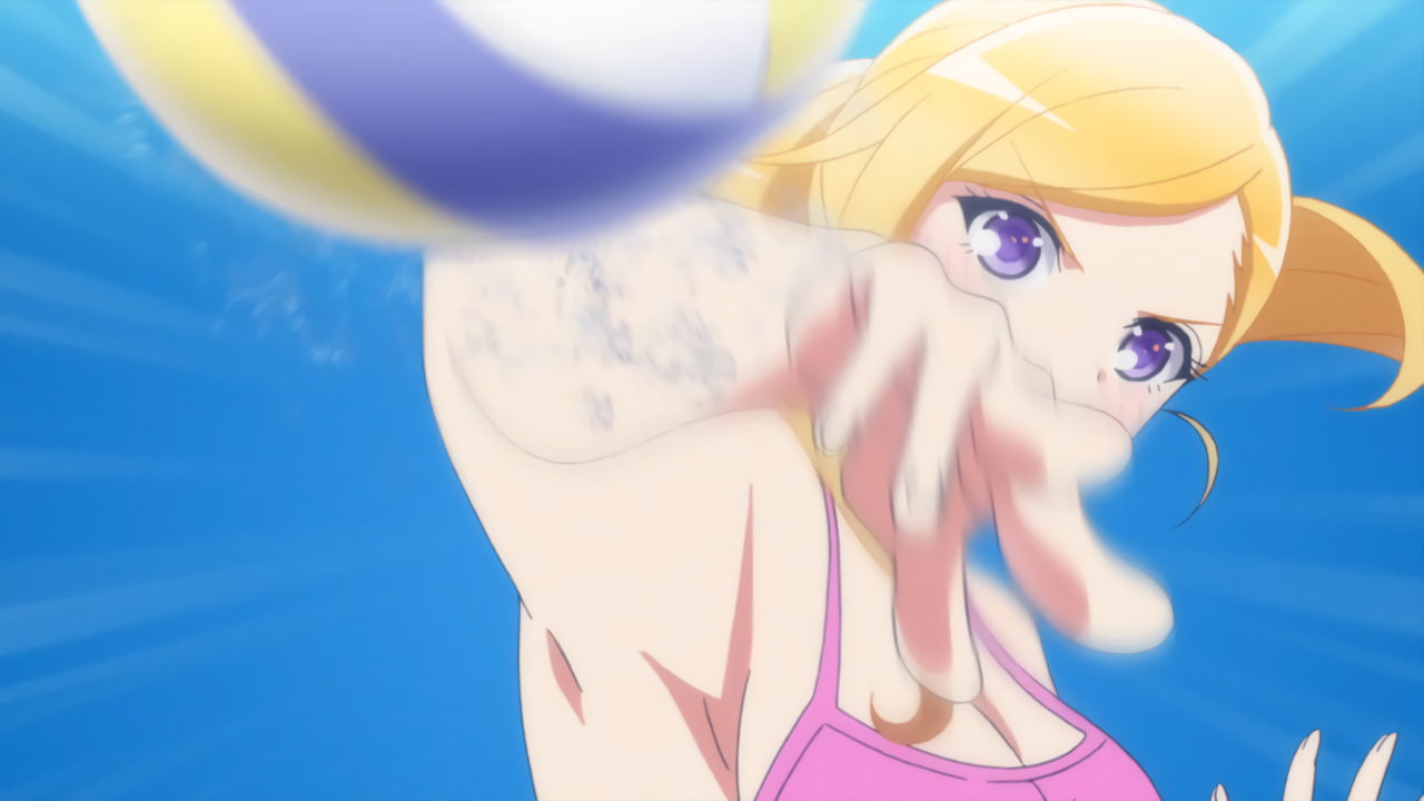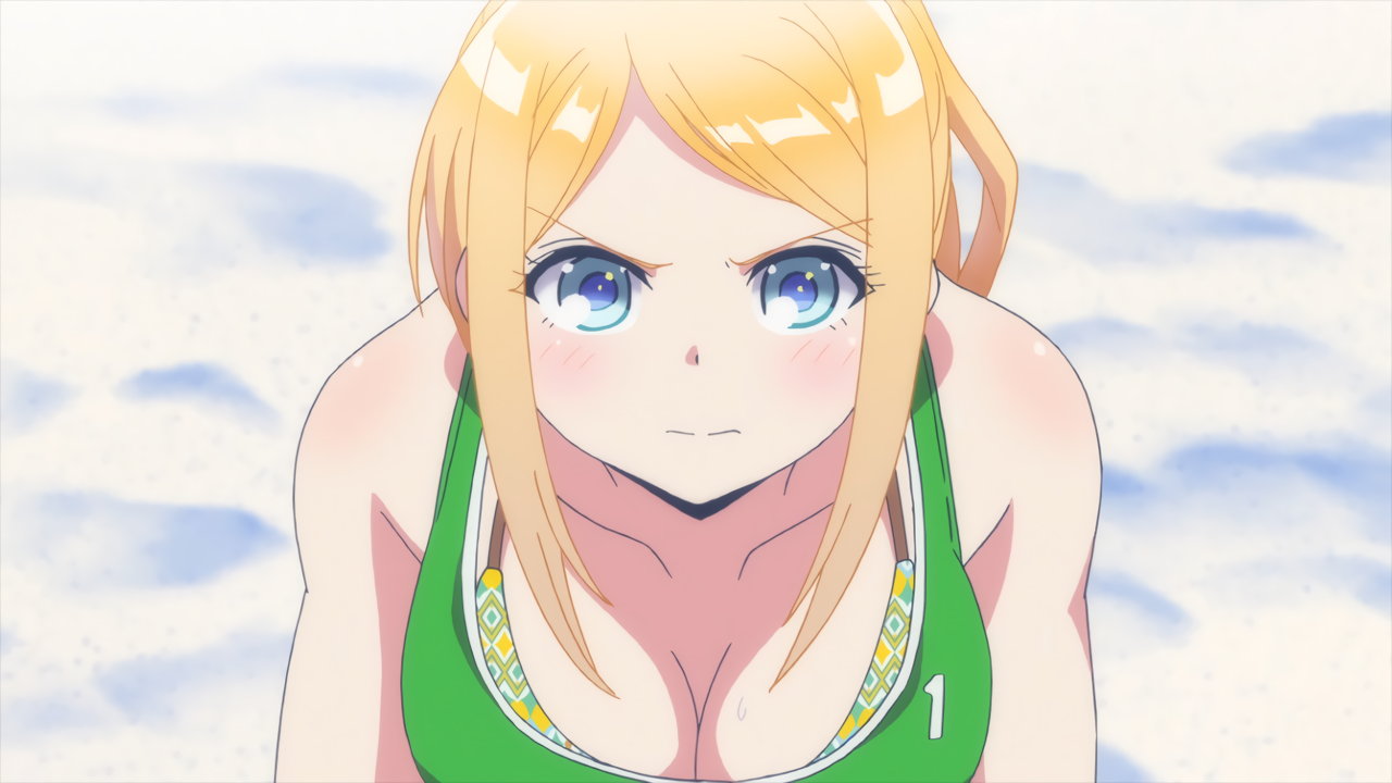 砂浜に集合する、水着姿の女子たち。なお本作品は至極健全な作品だが、ビーチバレーが題材のため常時水着回が続く。