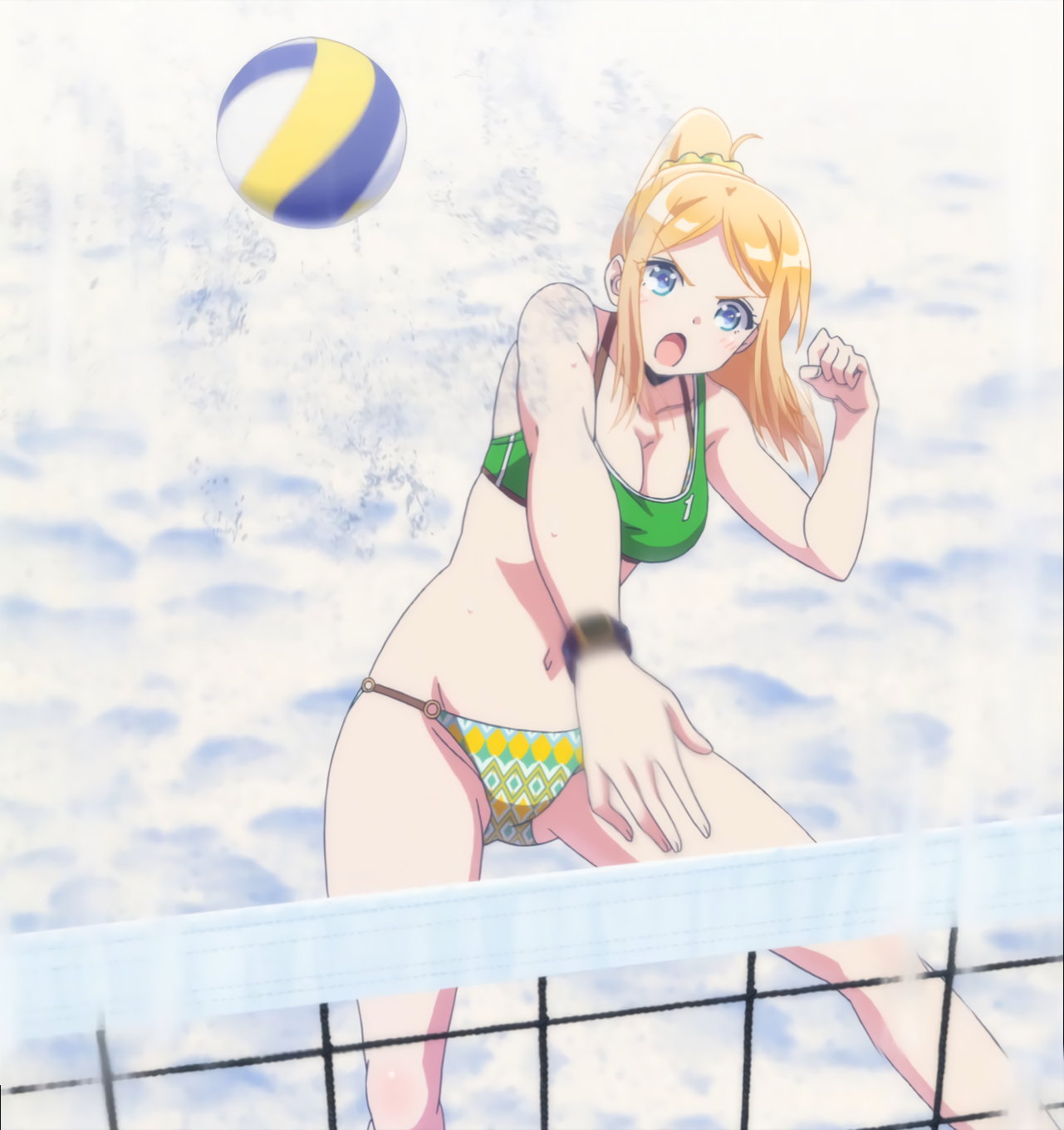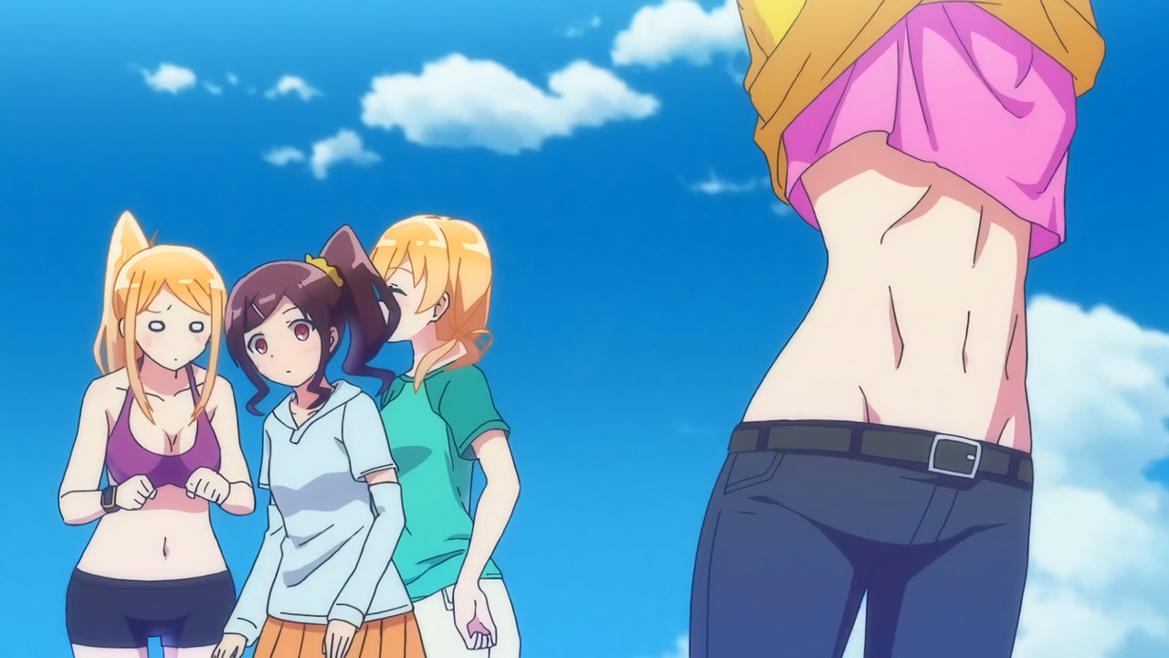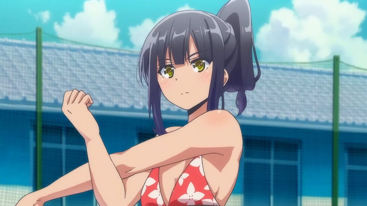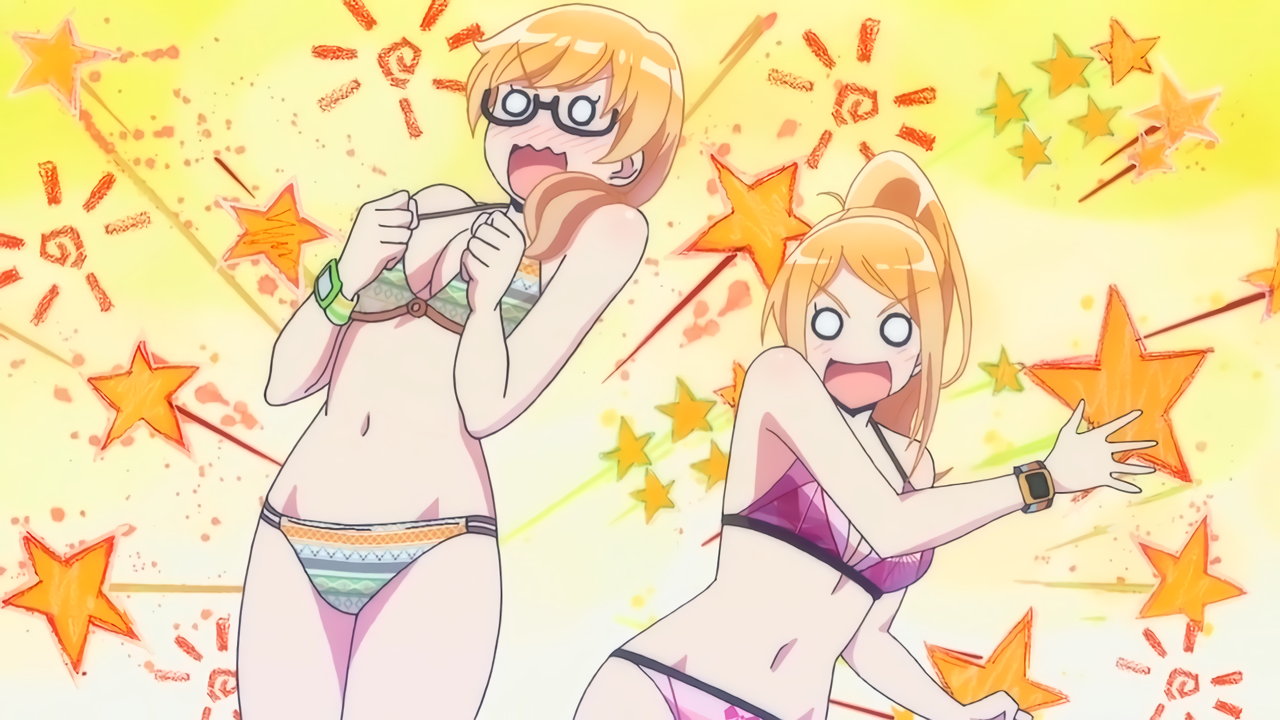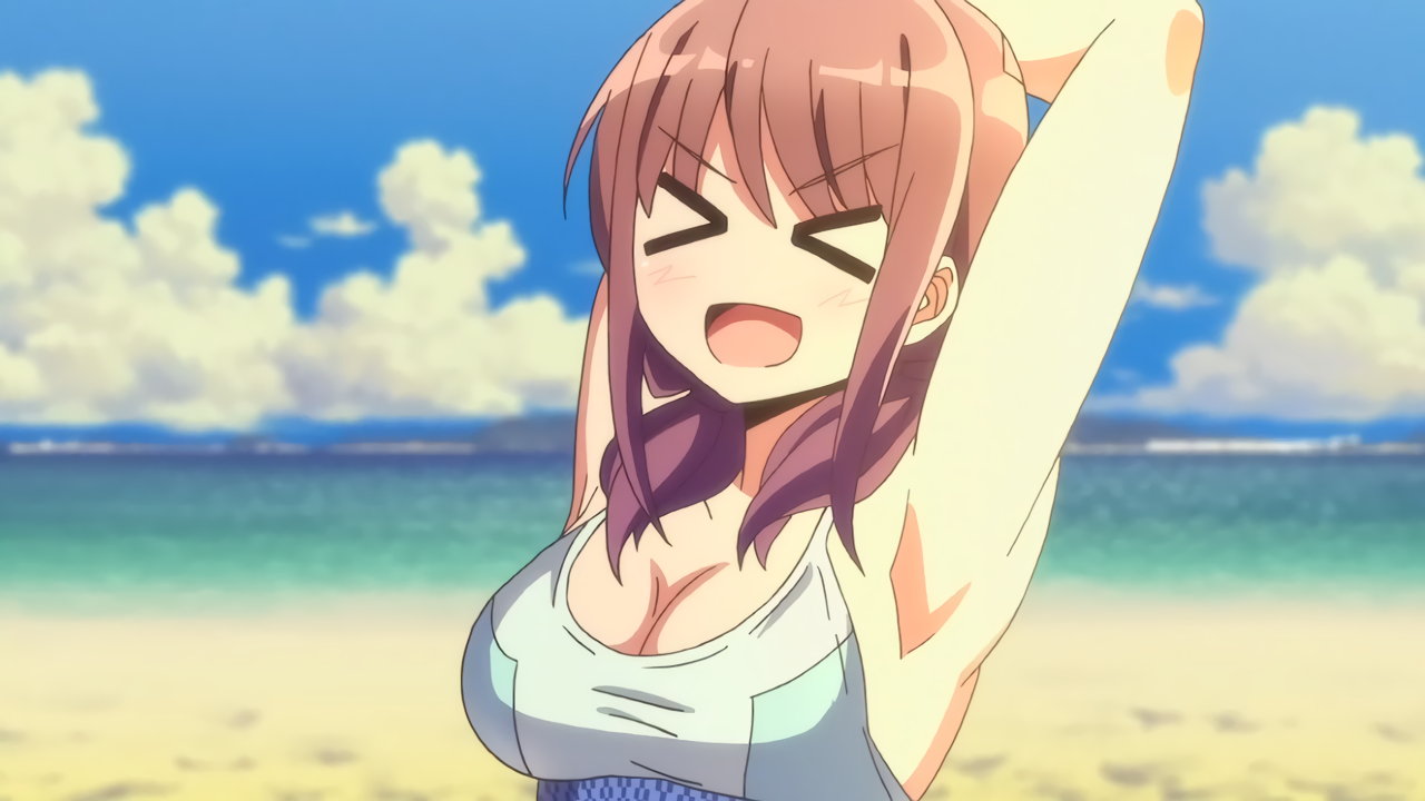 砂浜に集合する、水着姿の女子たち。なお本作品は至極健全な作品だが、ビーチバレーが題材のため常時水着回が続く。
