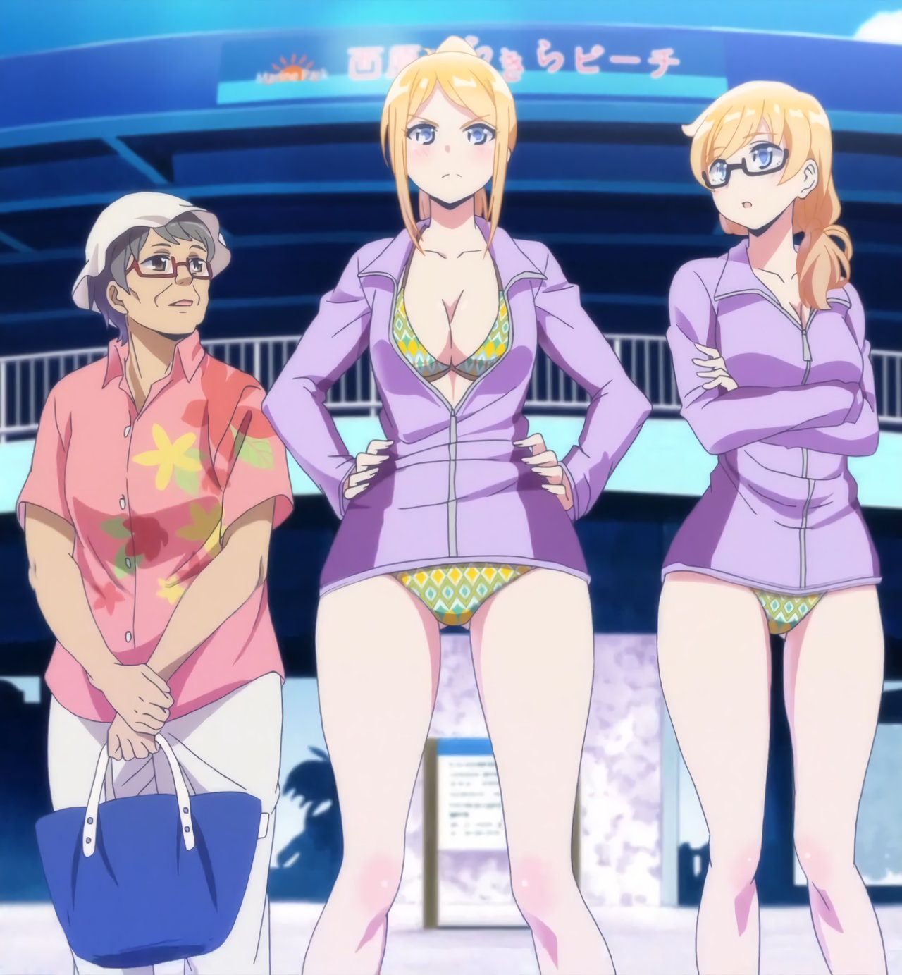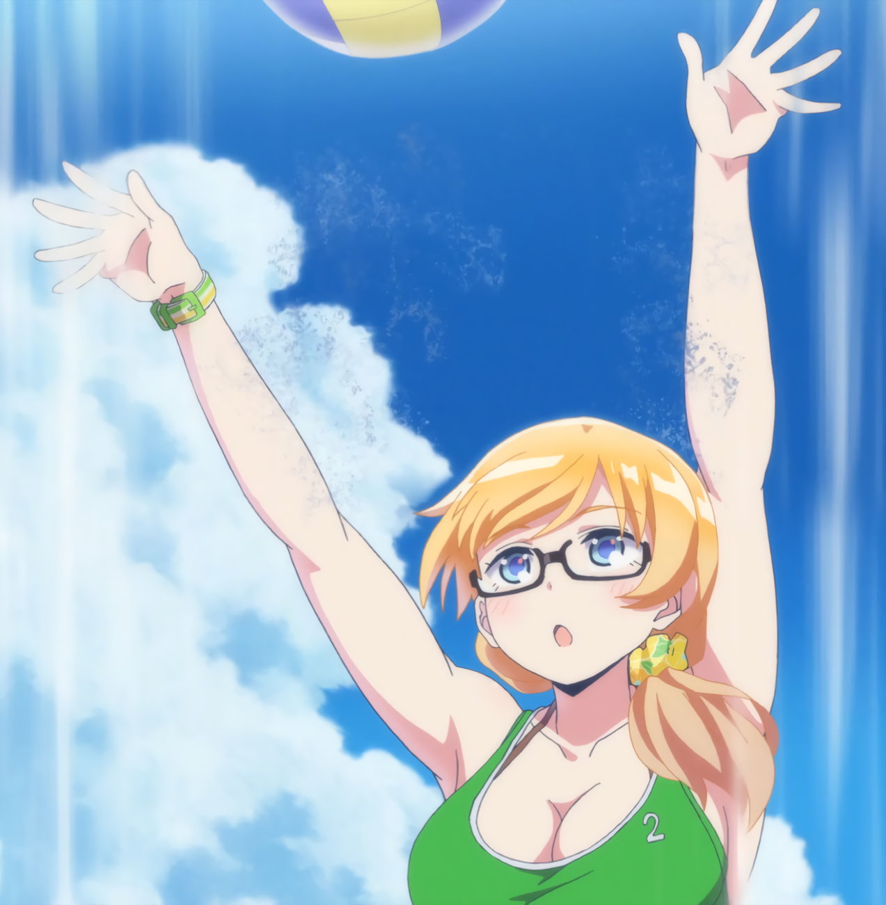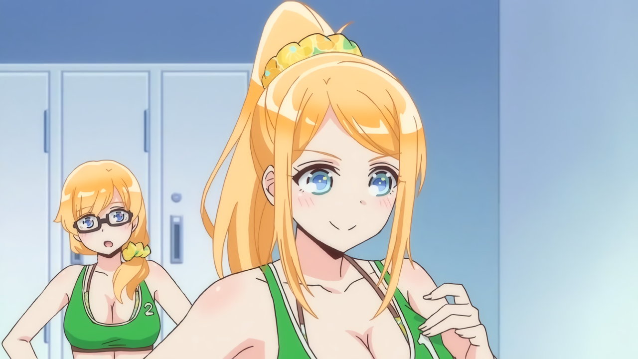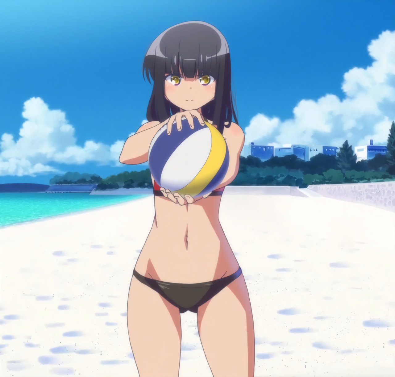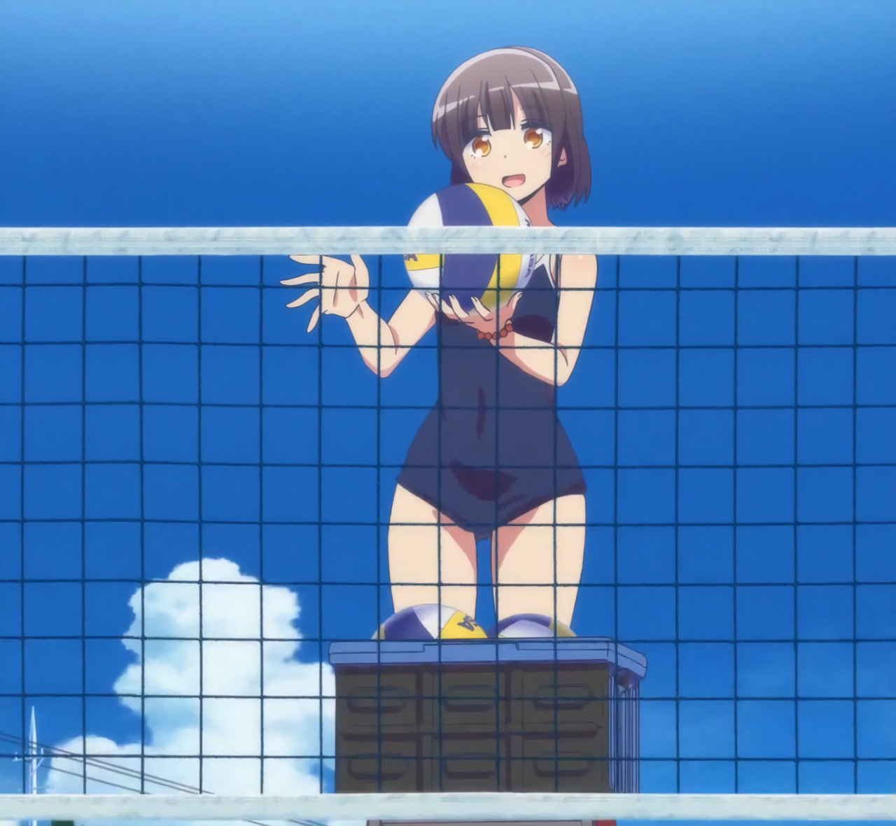 砂浜に集合する、水着姿の女子たち。なお本作品は至極健全な作品だが、ビーチバレーが題材のため常時水着回が続く。