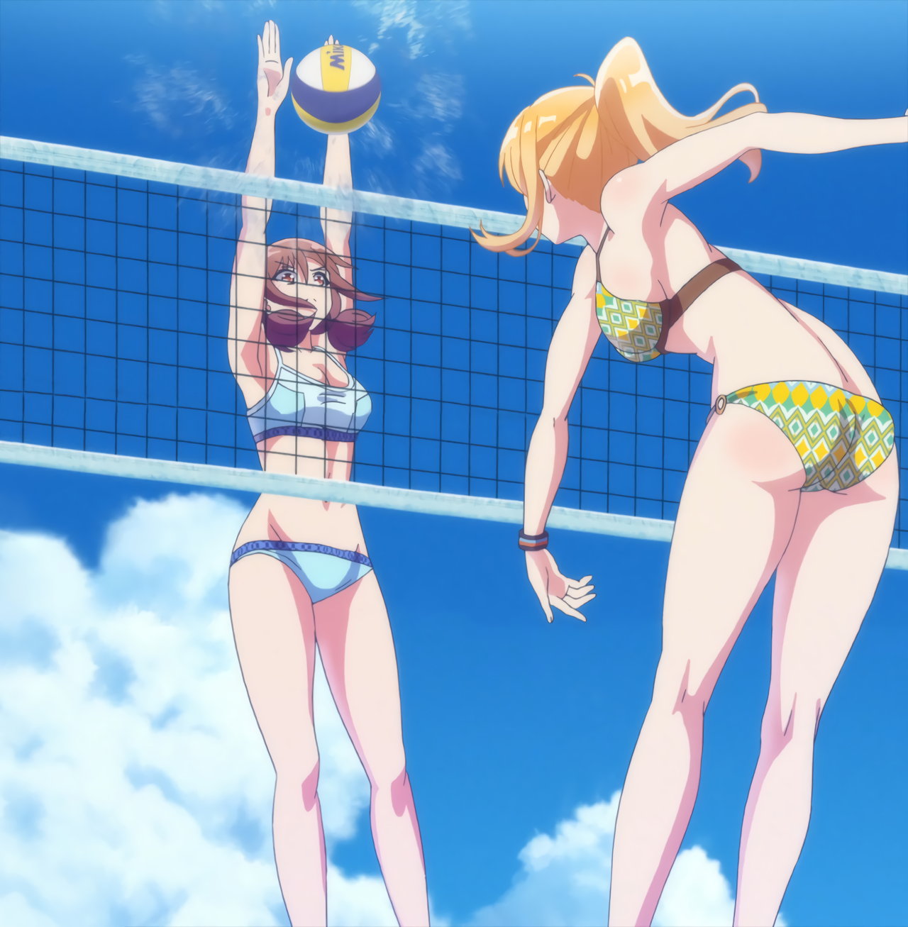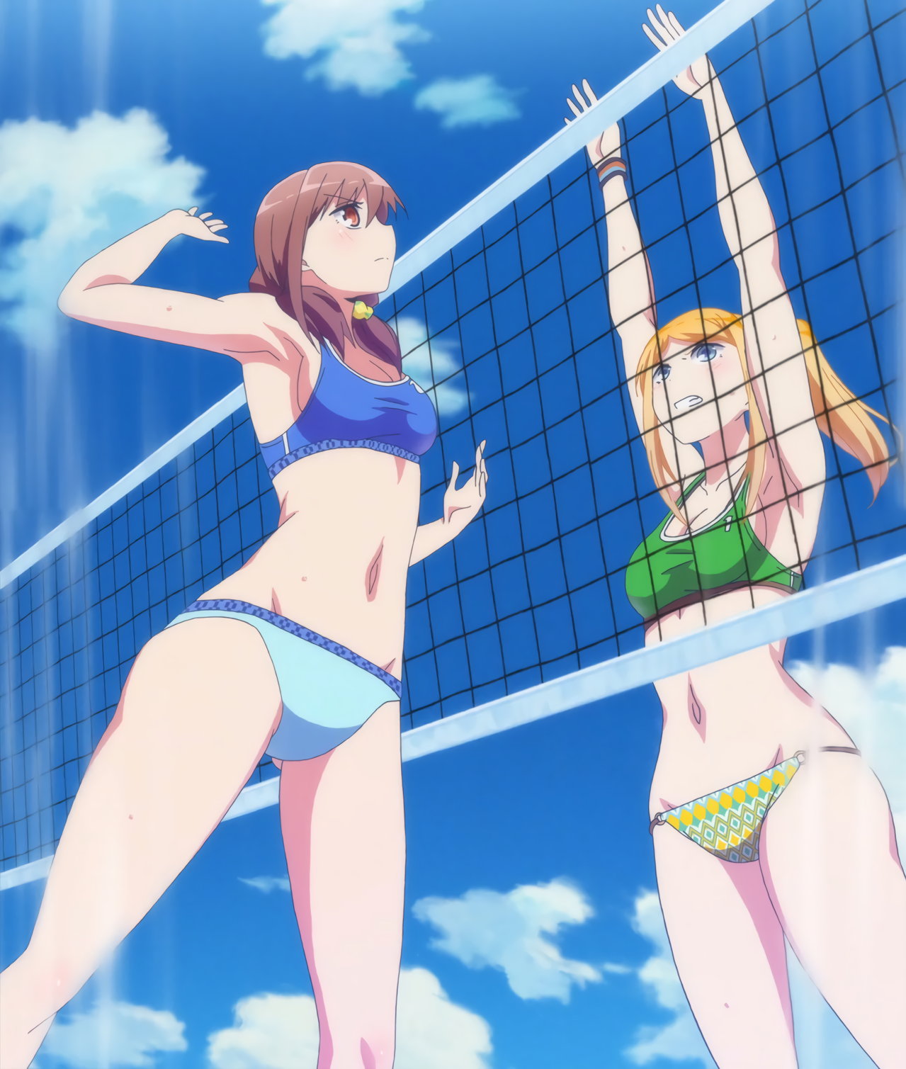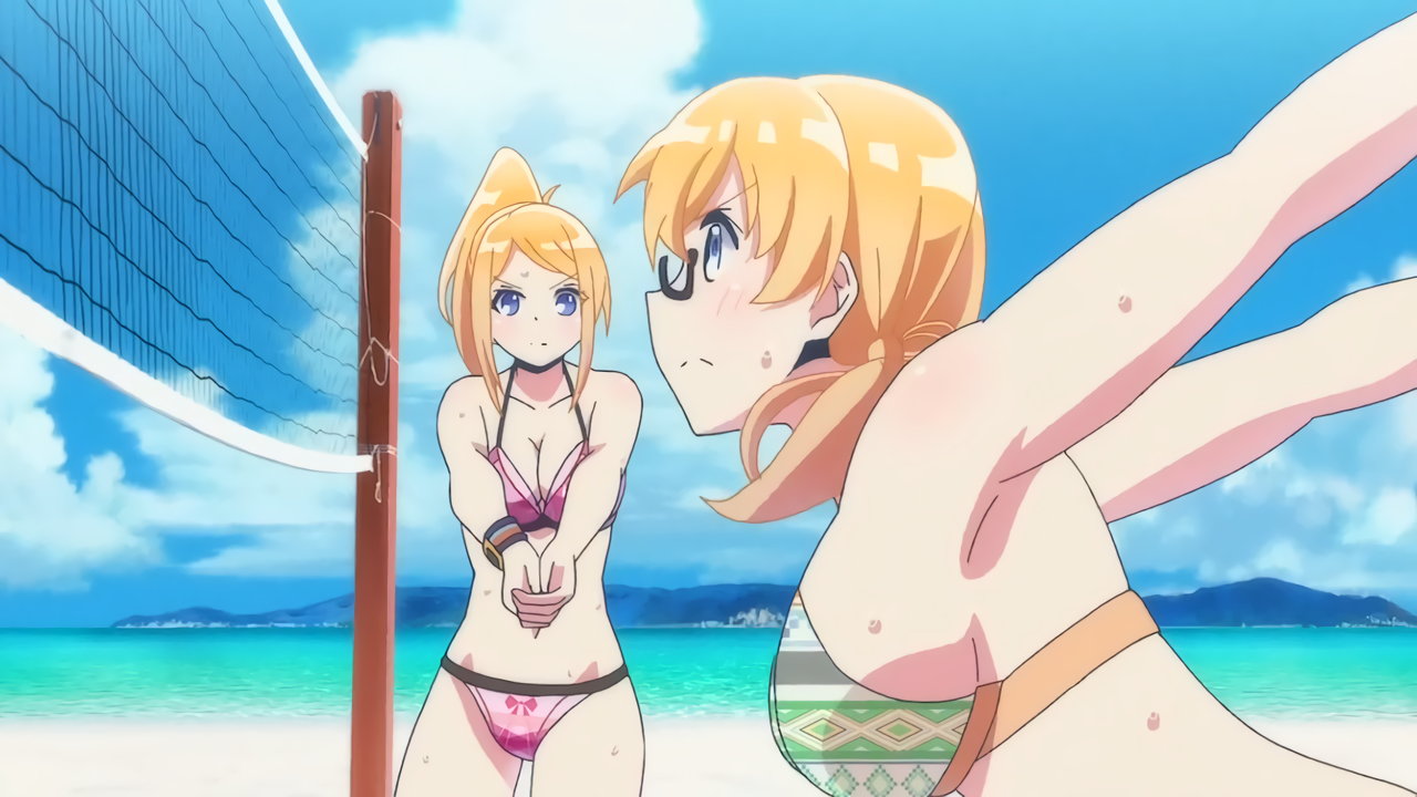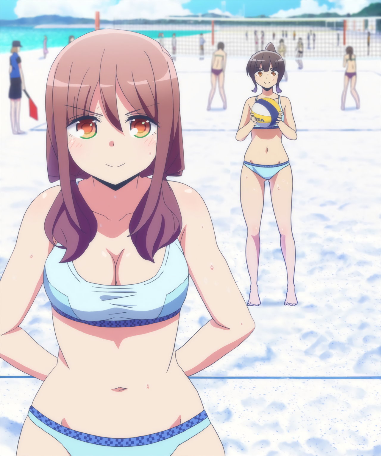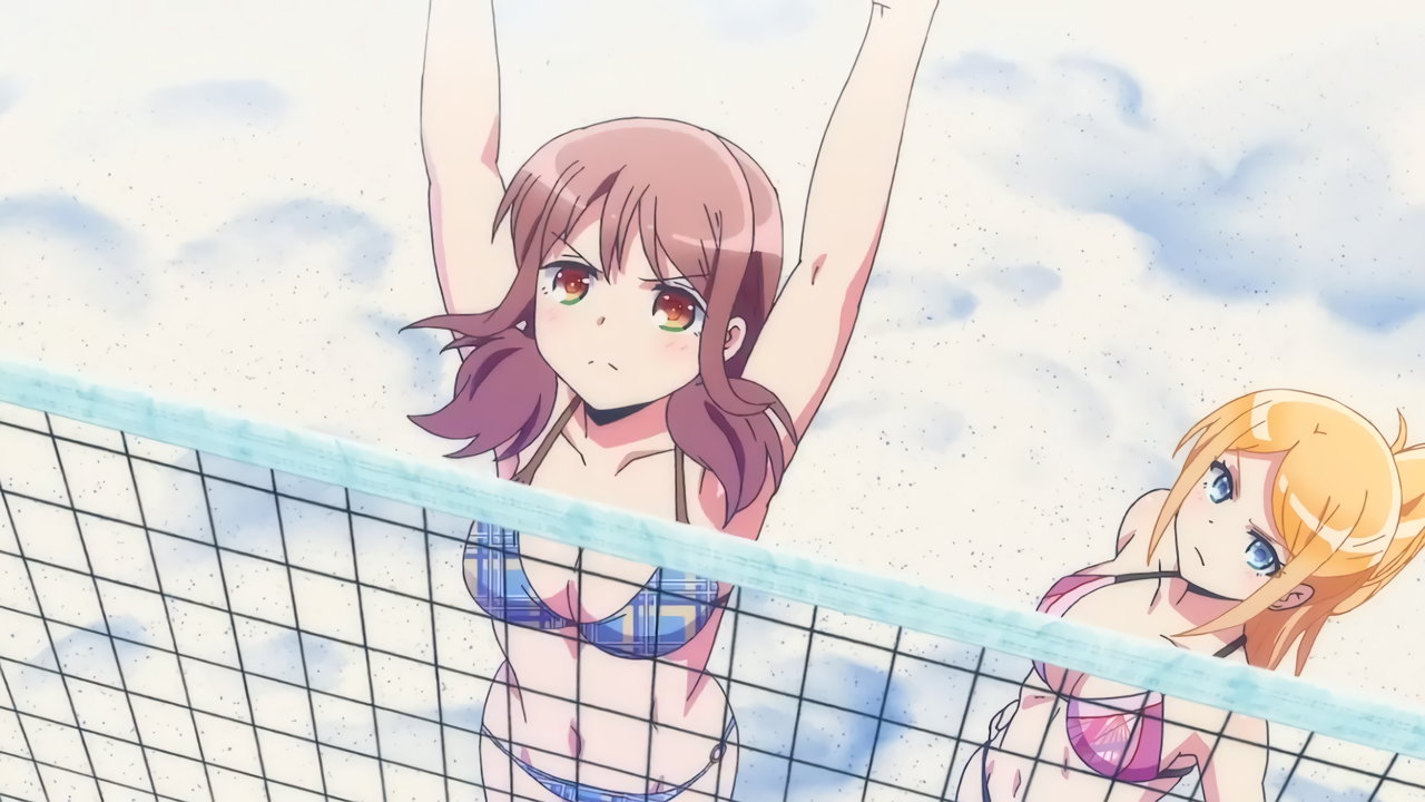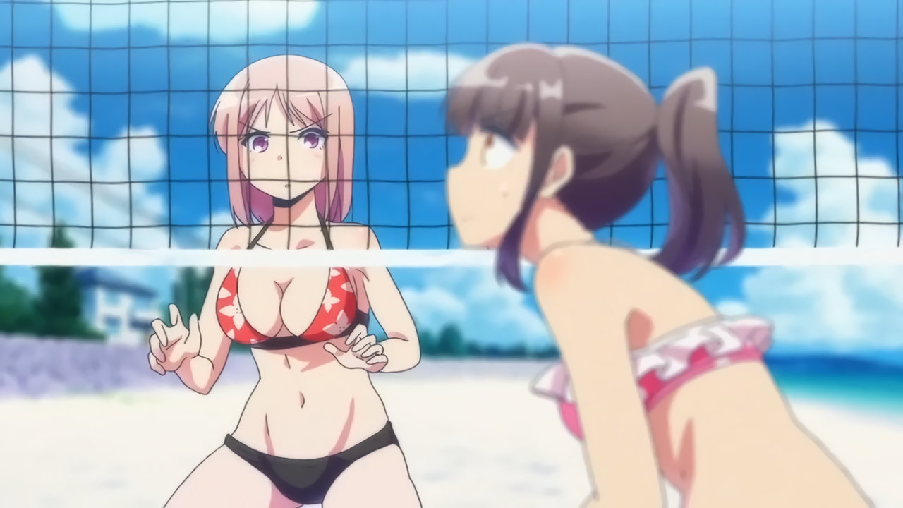 ビーチバレー中・水着姿のかなたとあかり。