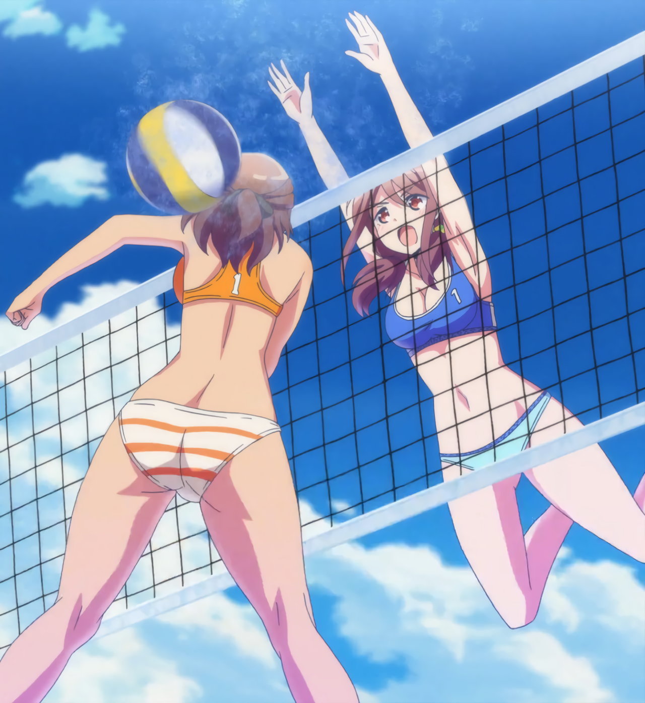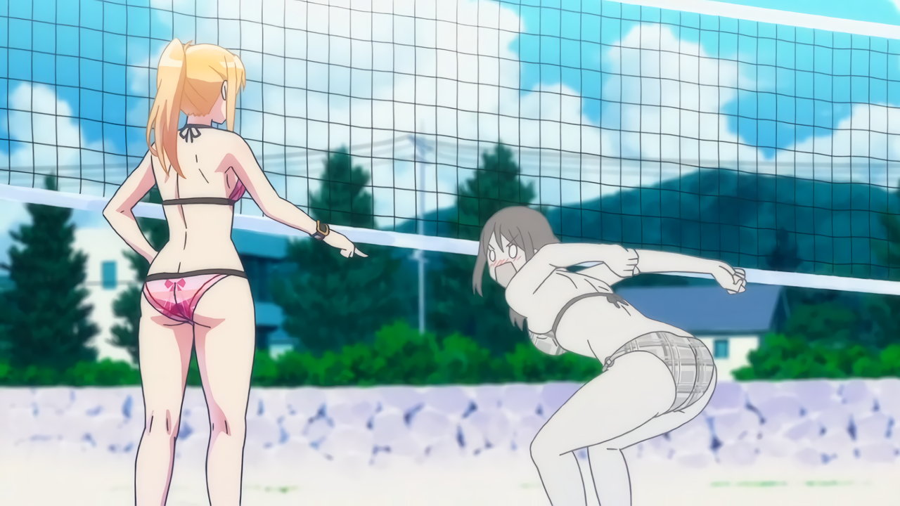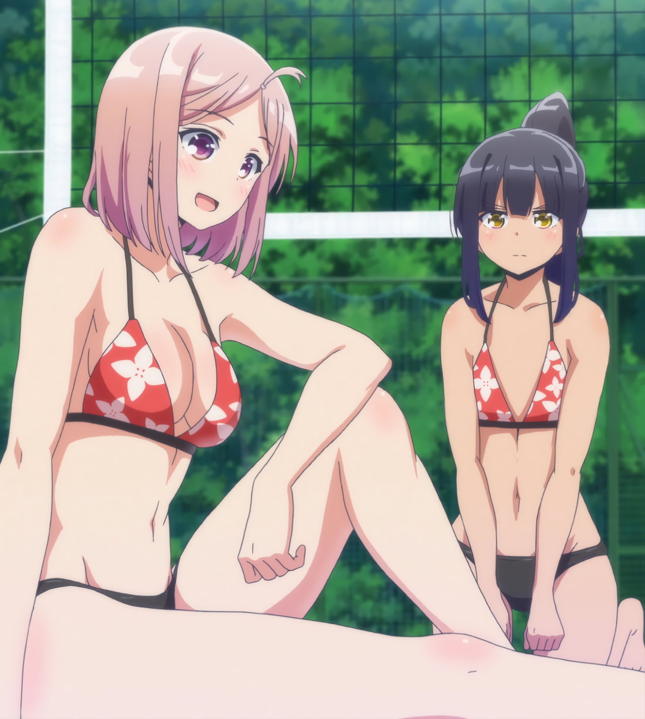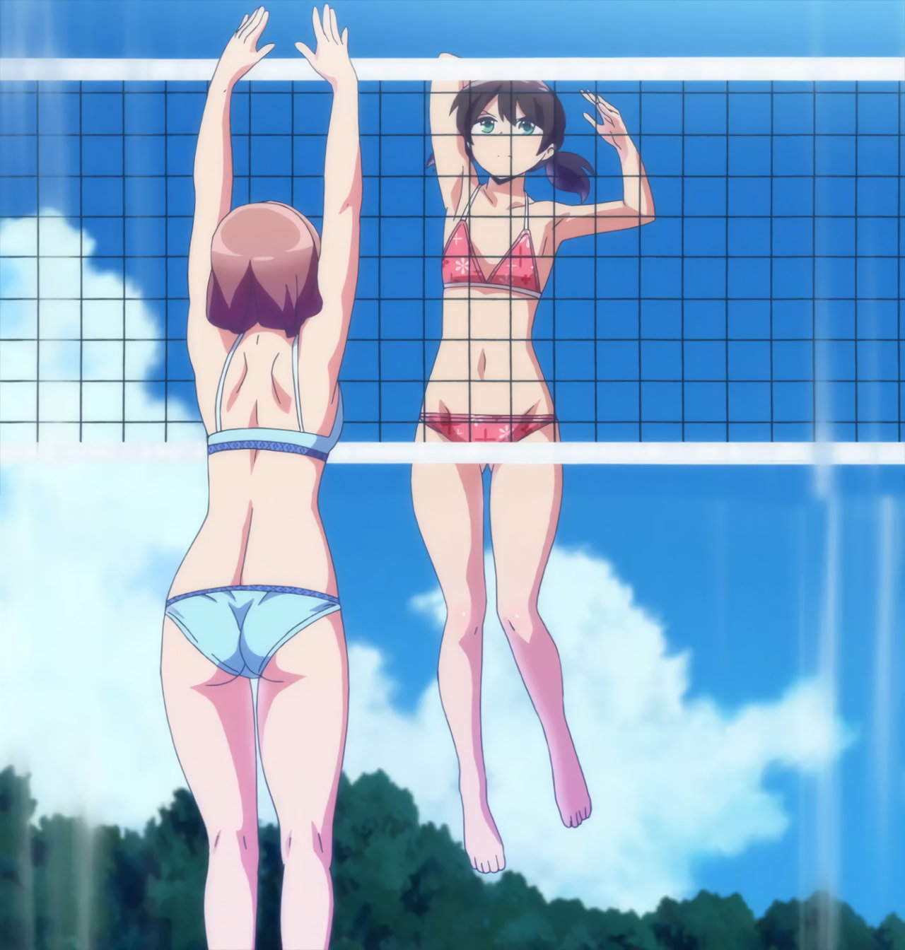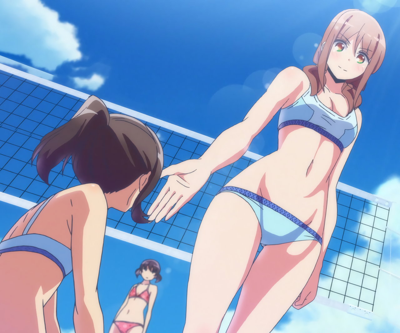 ビーチバレー中・水着姿のかなたとあかり。