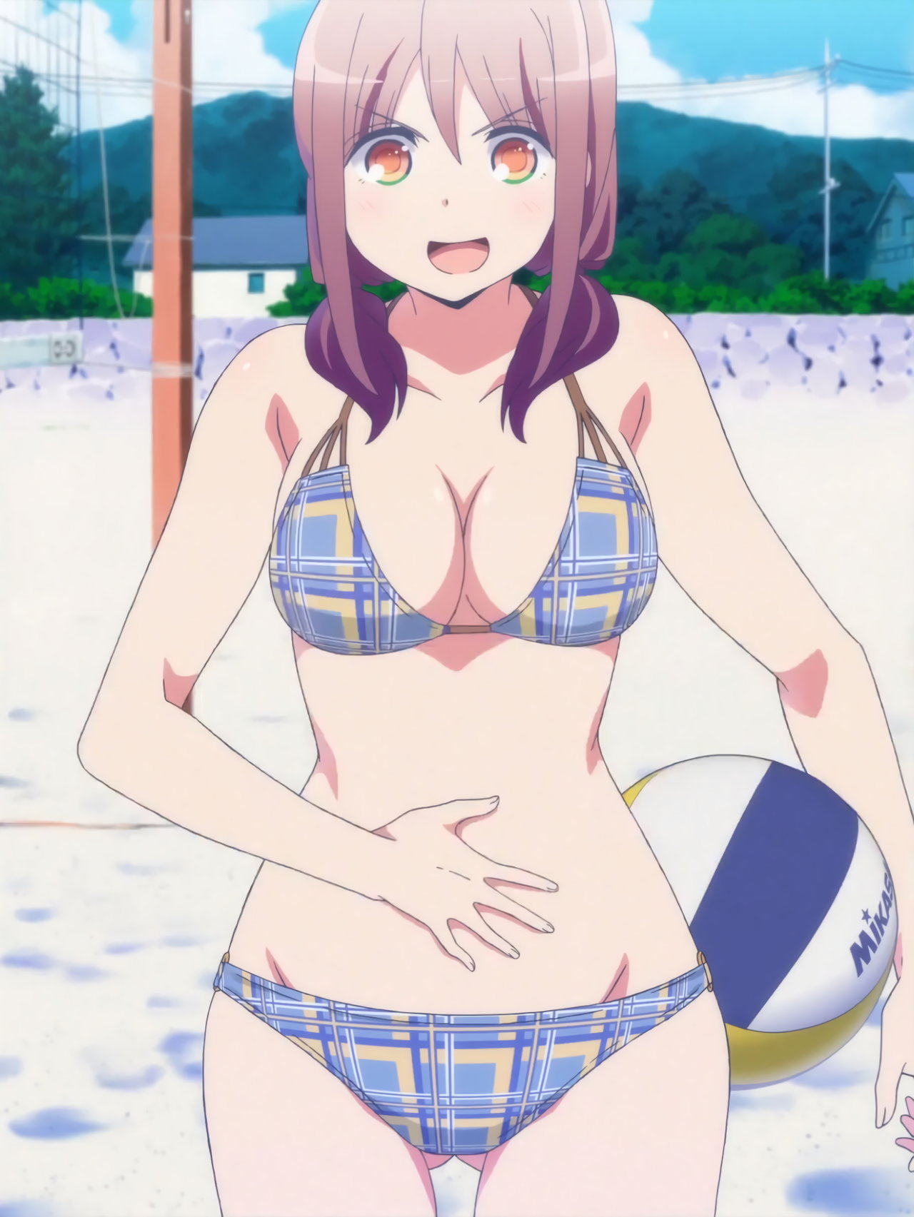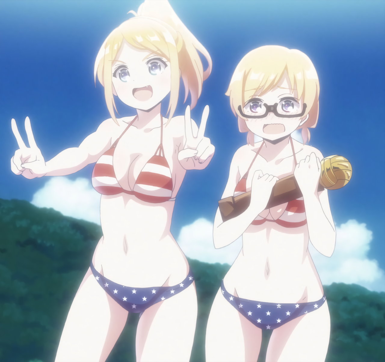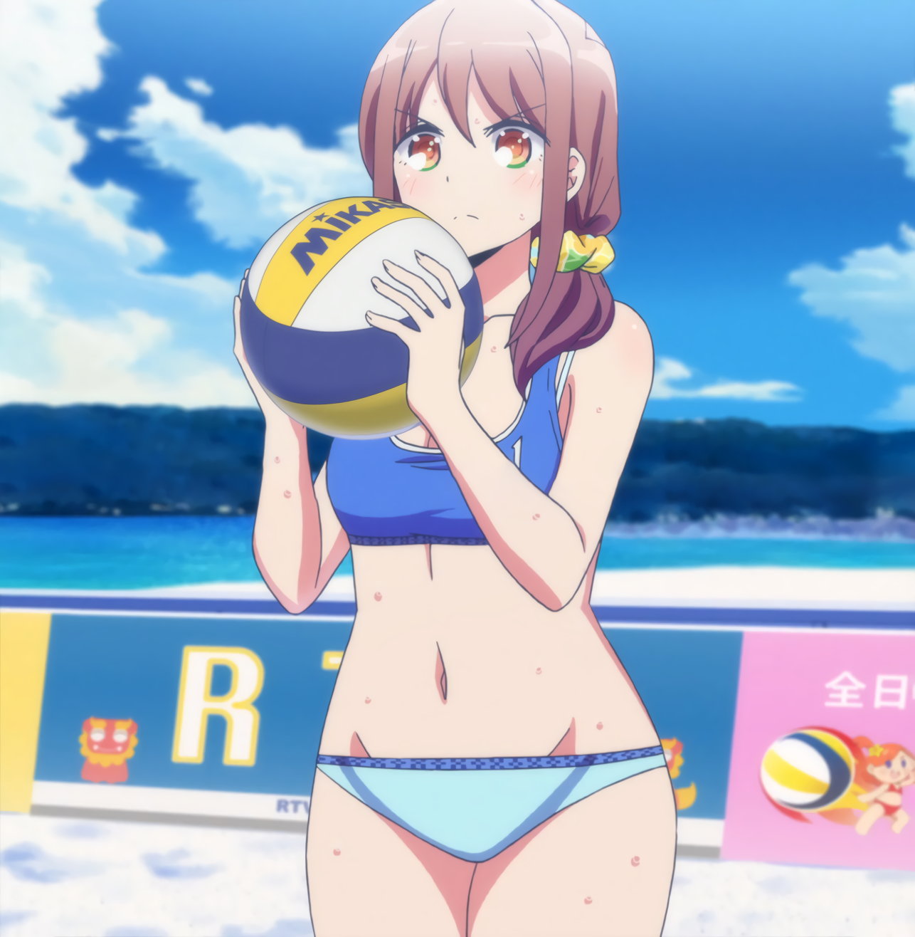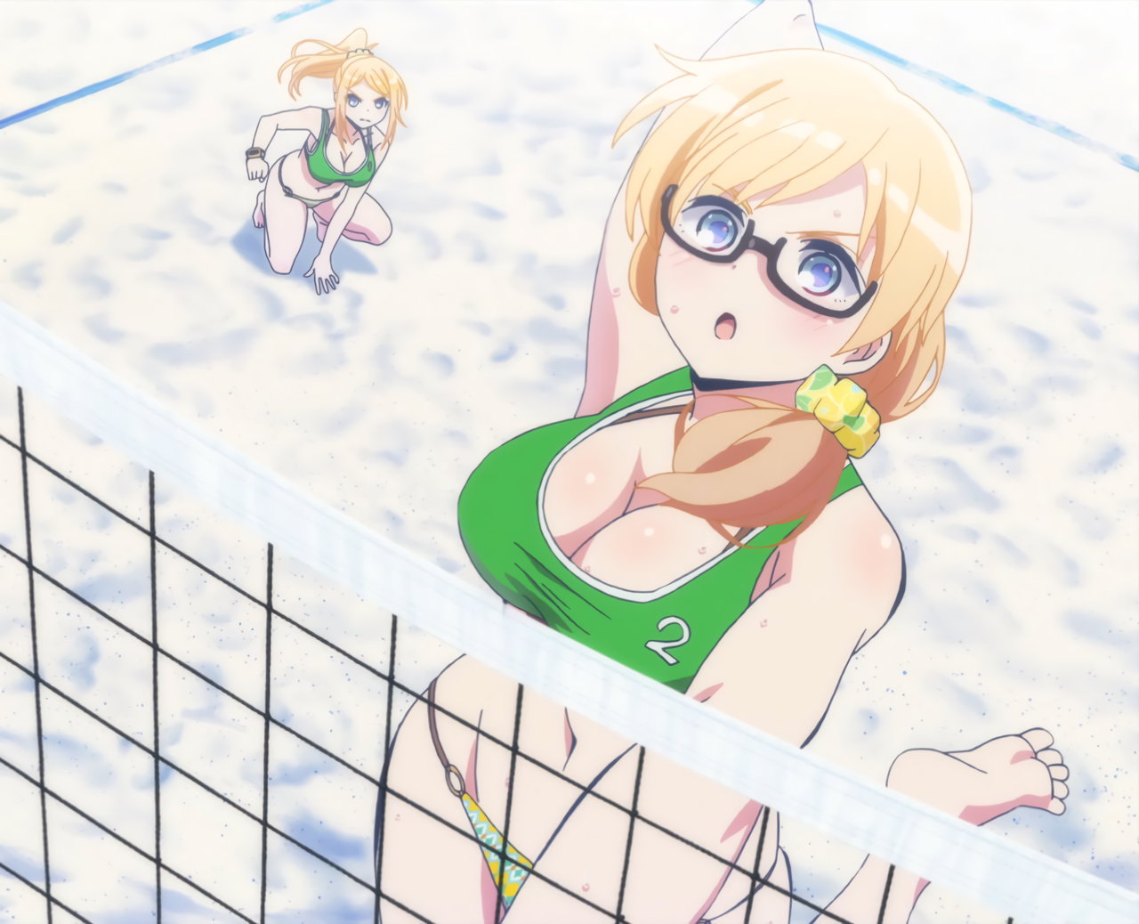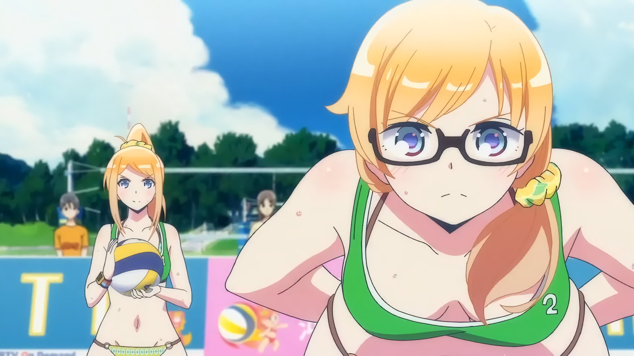 ビーチバレー中・水着姿のかなたとあかり。