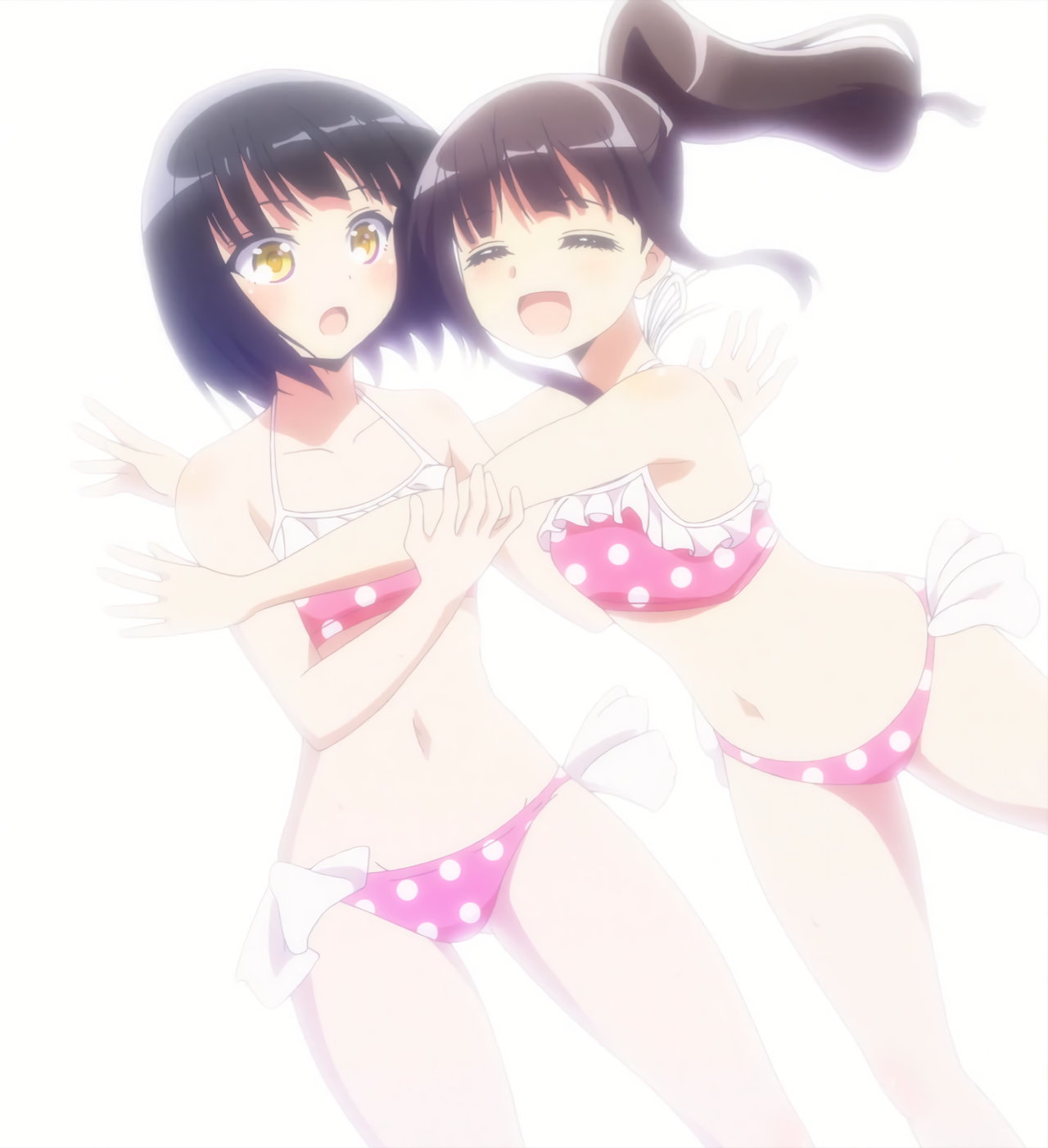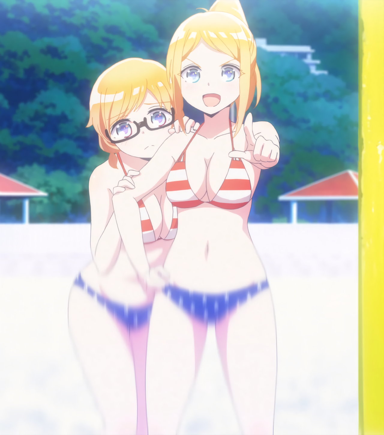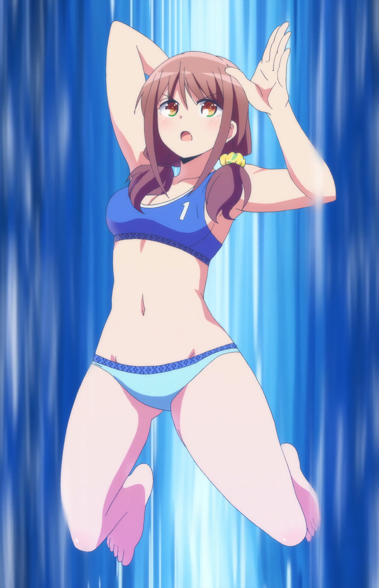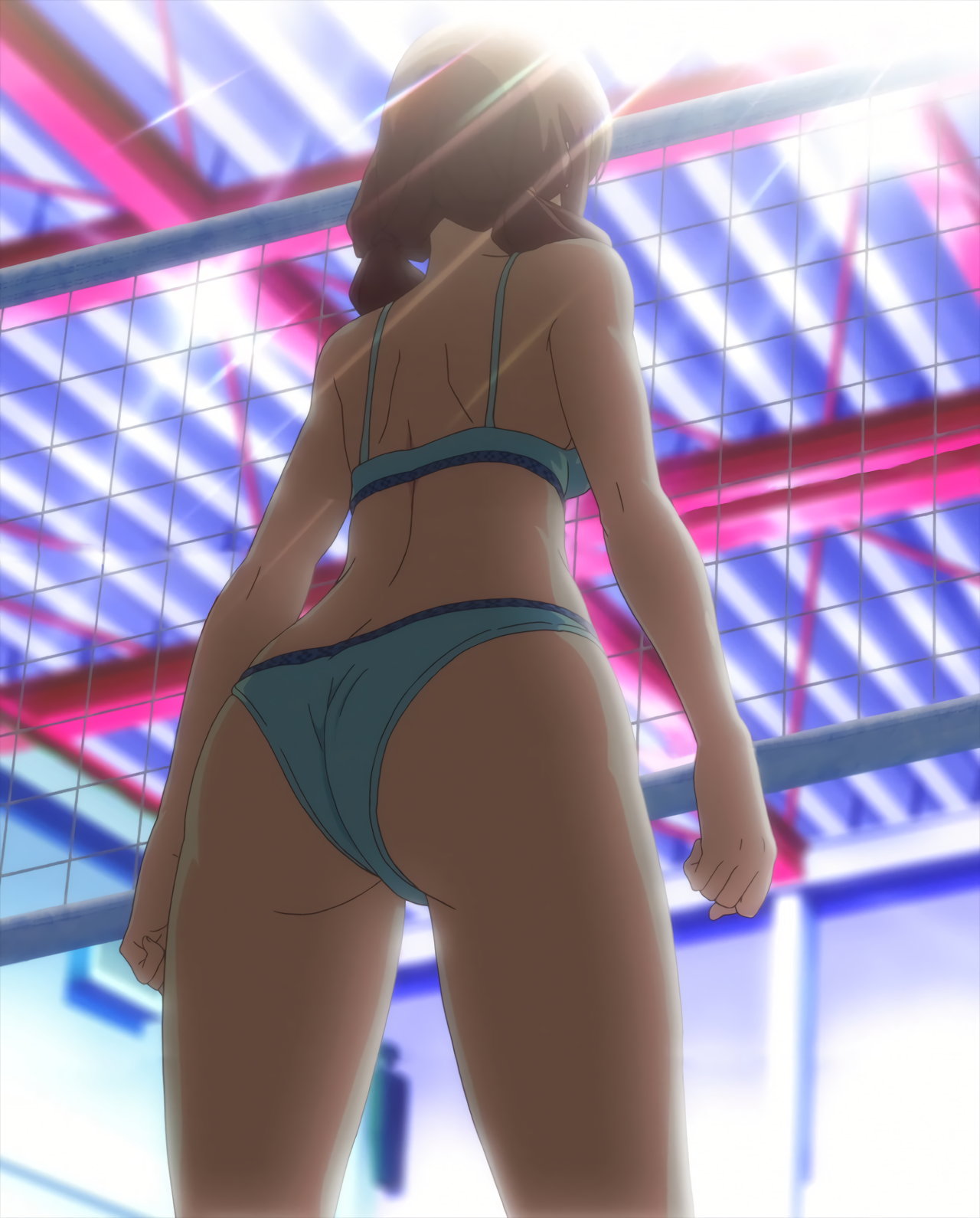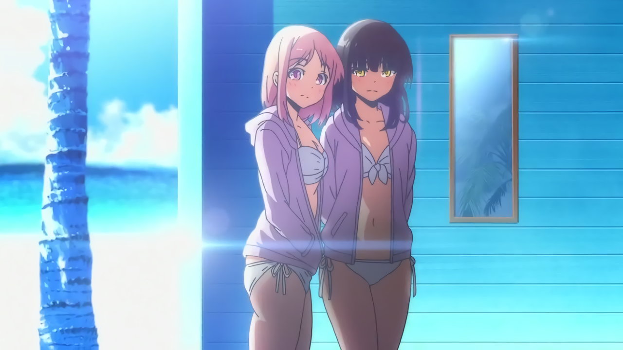 ビーチバレー中・水着姿のかなたとあかり。
