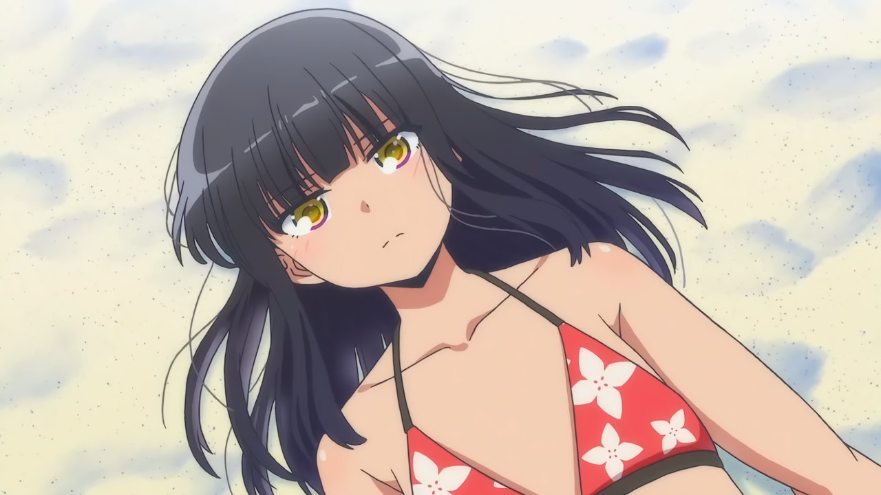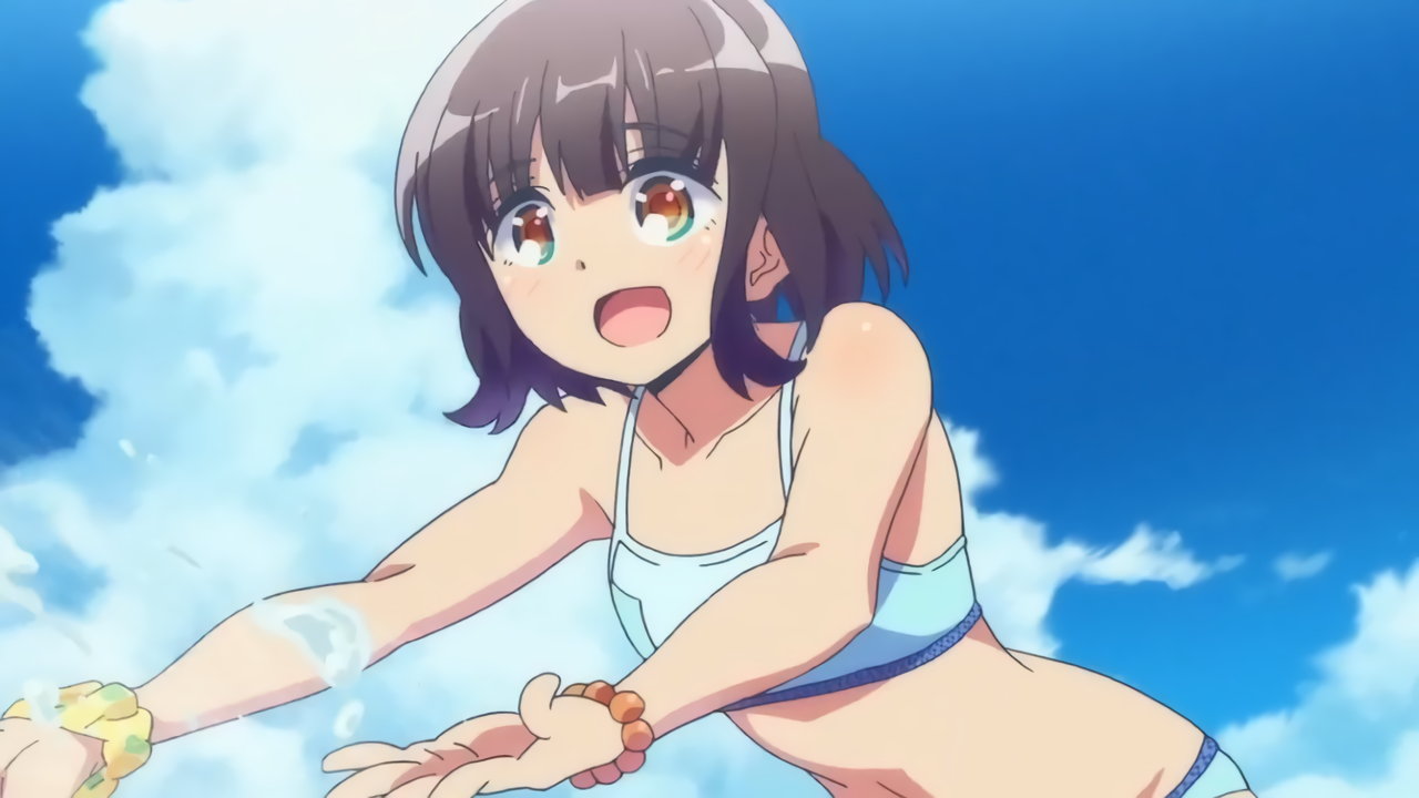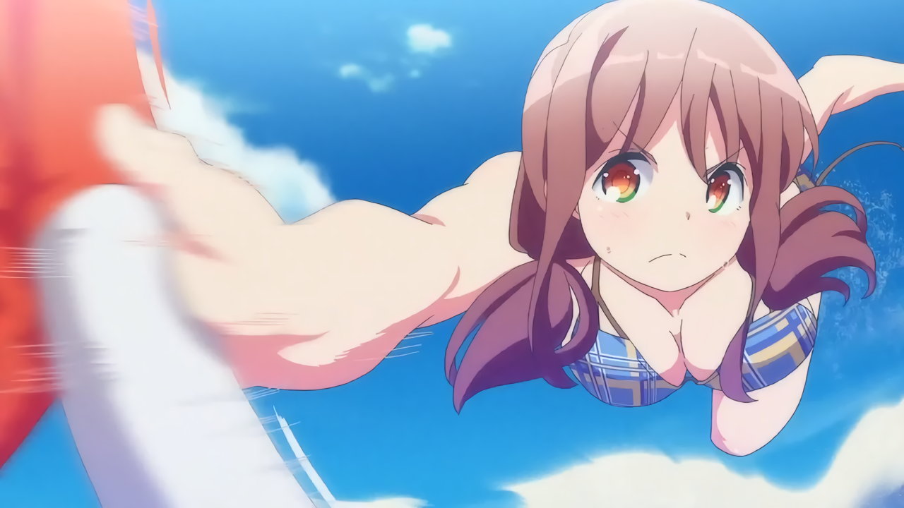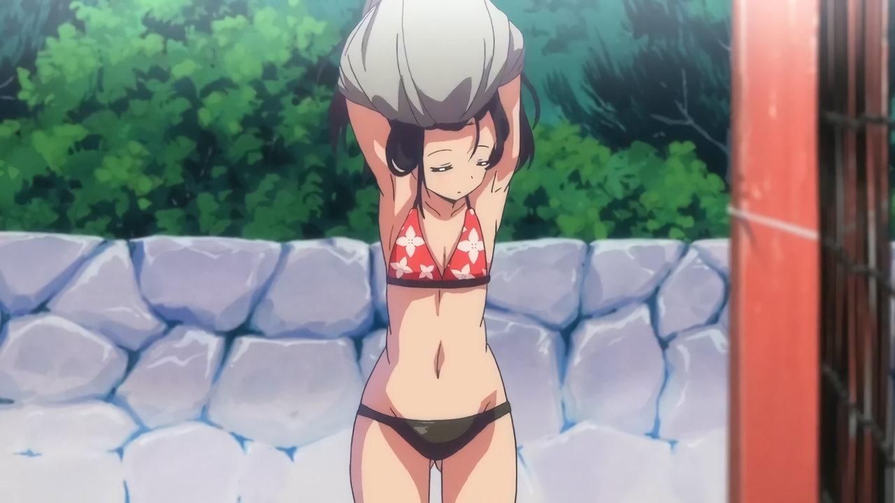 Tシャツを脱ぎ捨て、上半身水着姿になる紅愛。