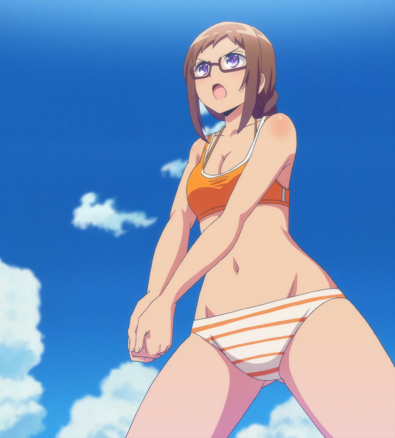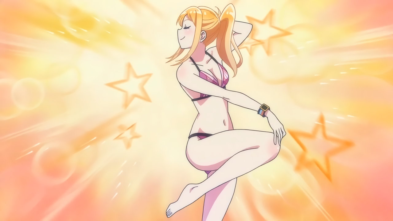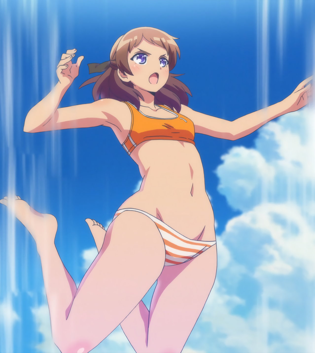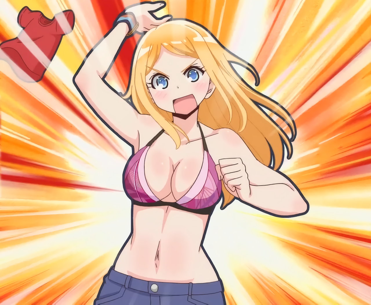 Tシャツを脱ぎ捨て、上半身水着姿になる紅愛。