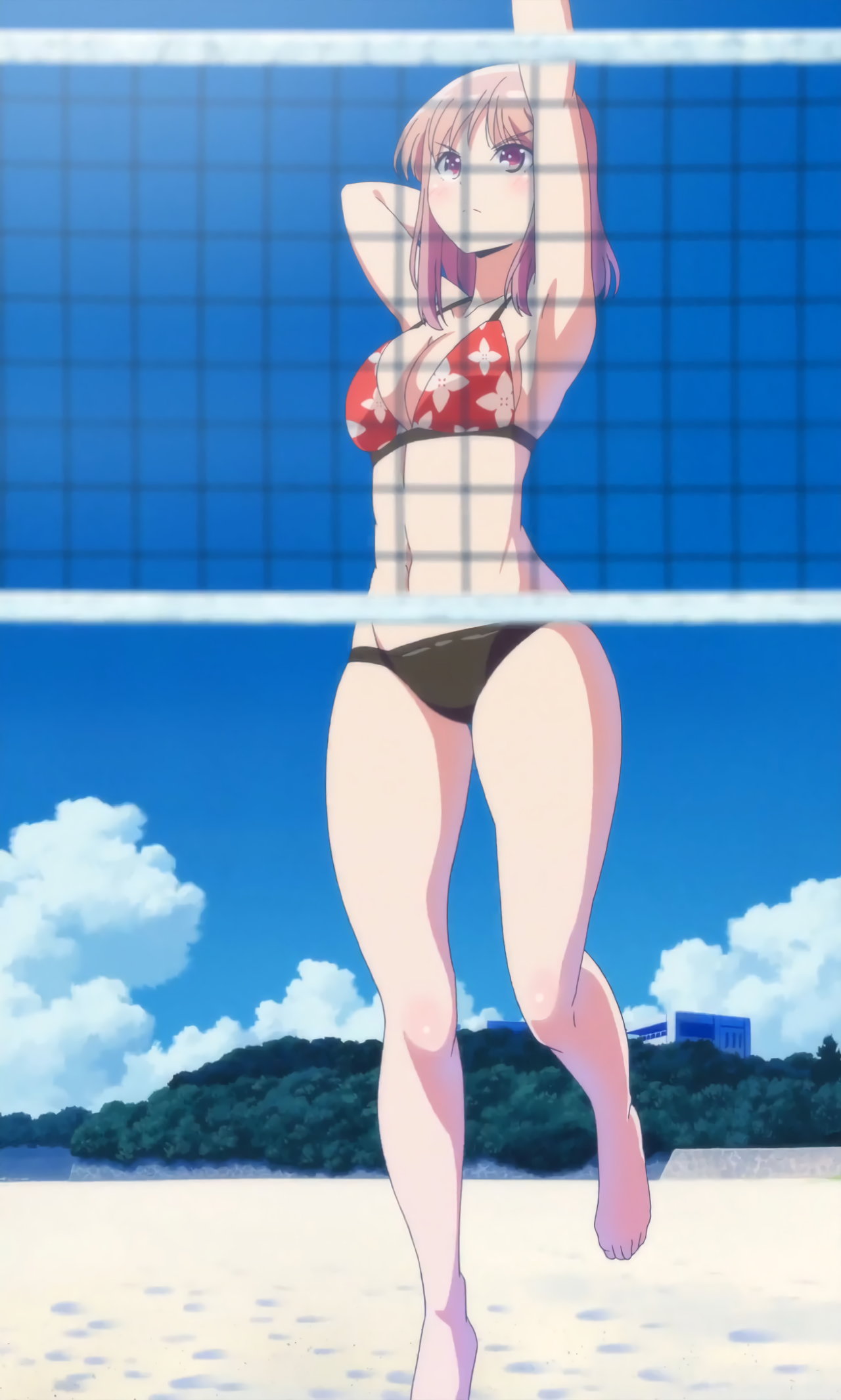 ビーチバレー試合中・水着姿の遥、かなた、紅愛、恵美理。