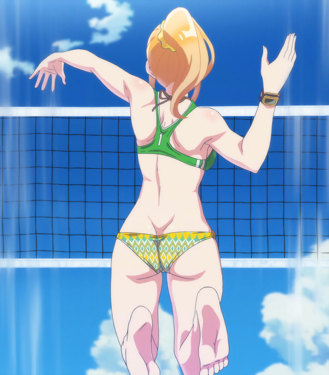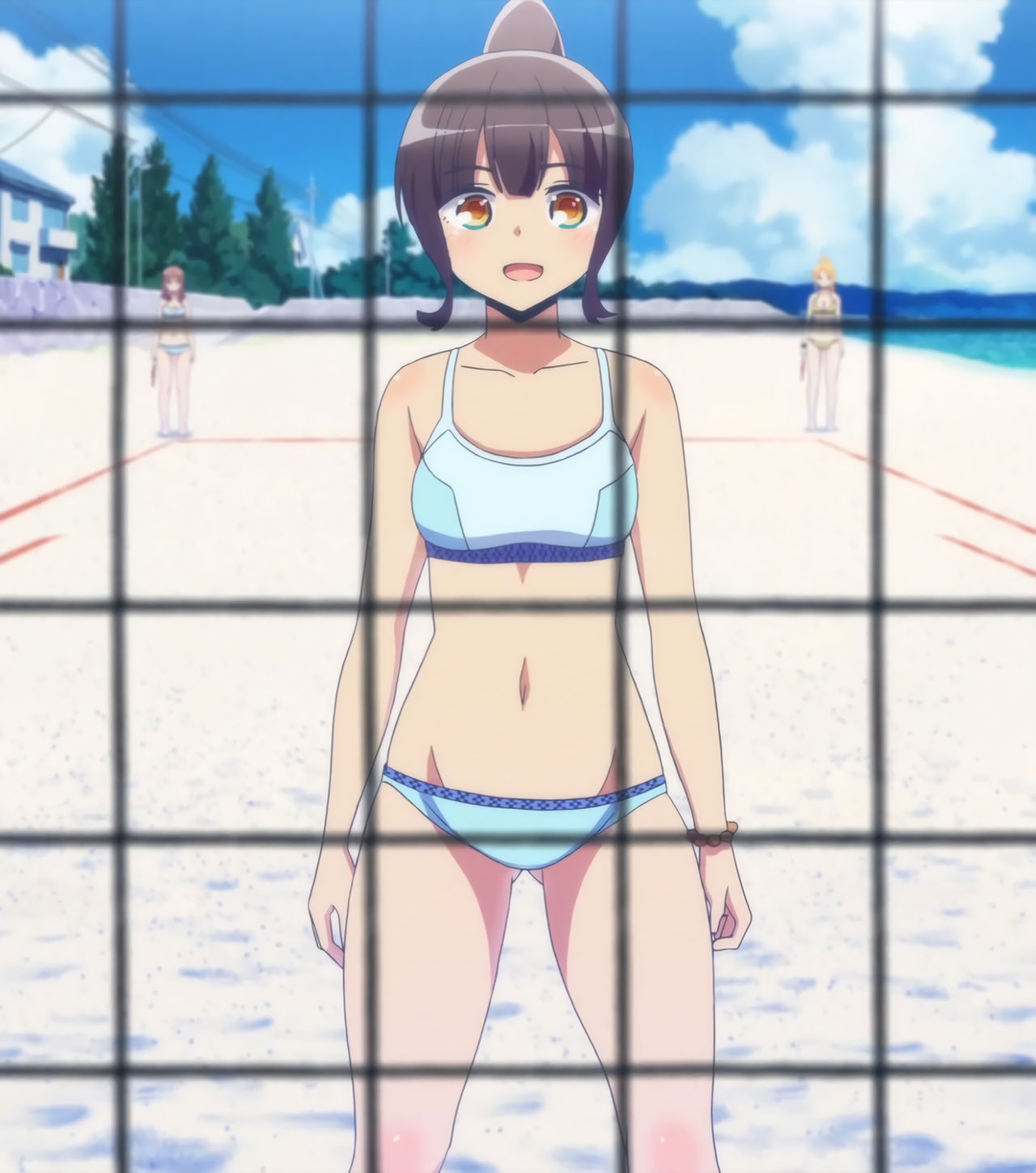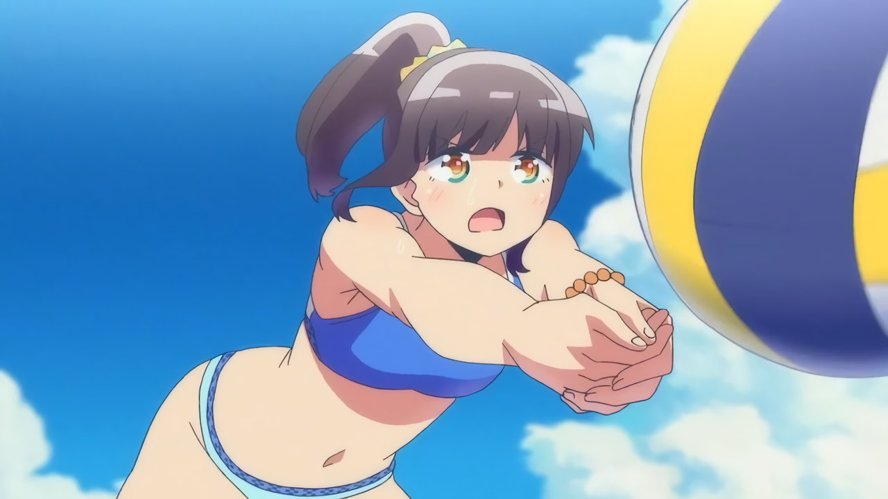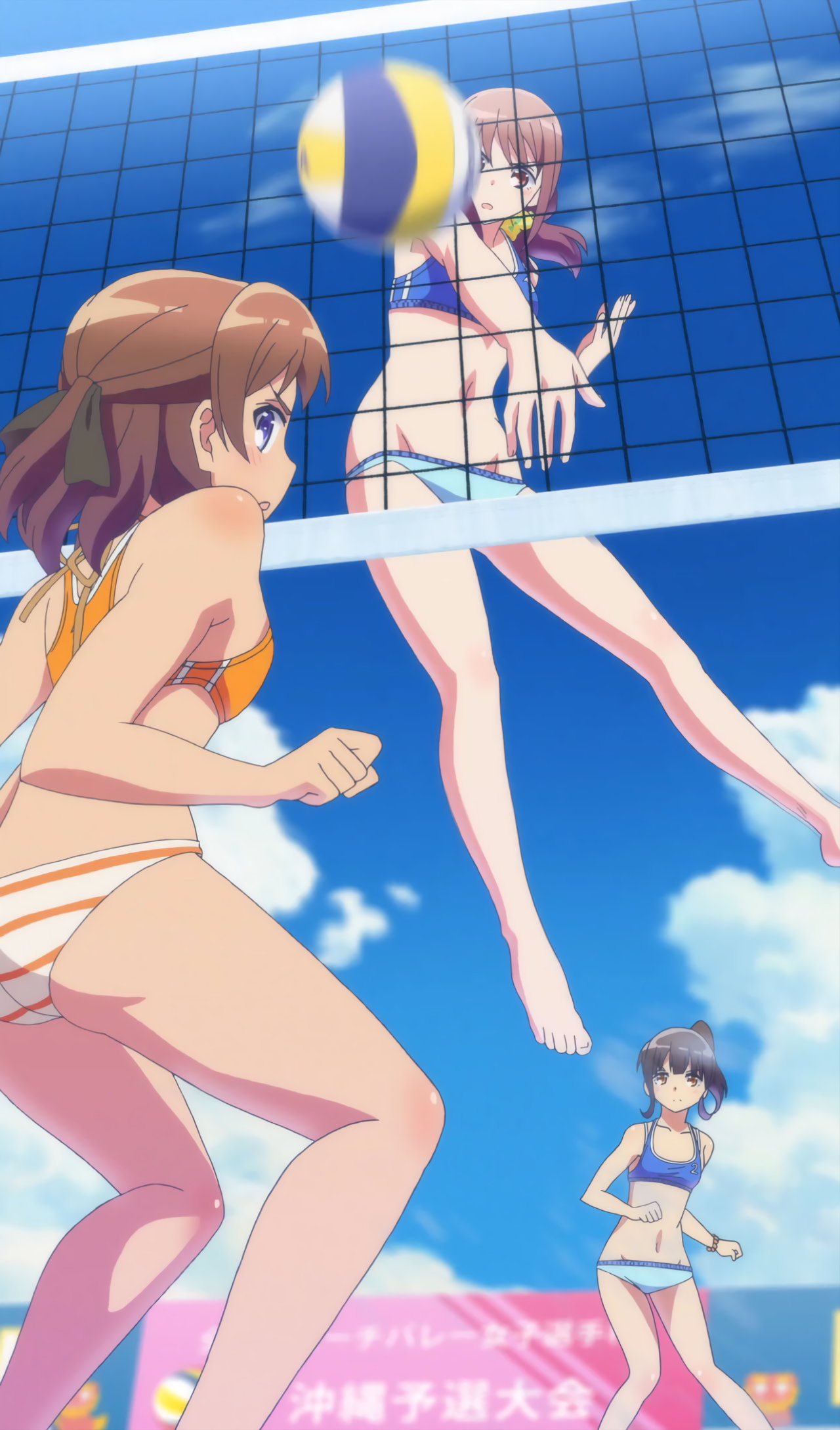 ビーチバレー試合中・水着姿の成美、彩紗、遥、かなた。