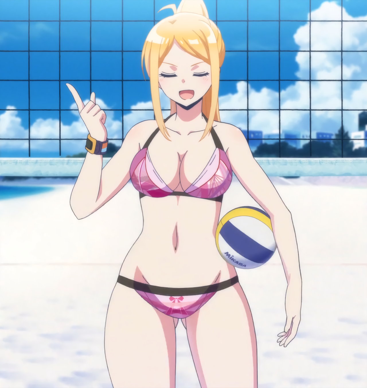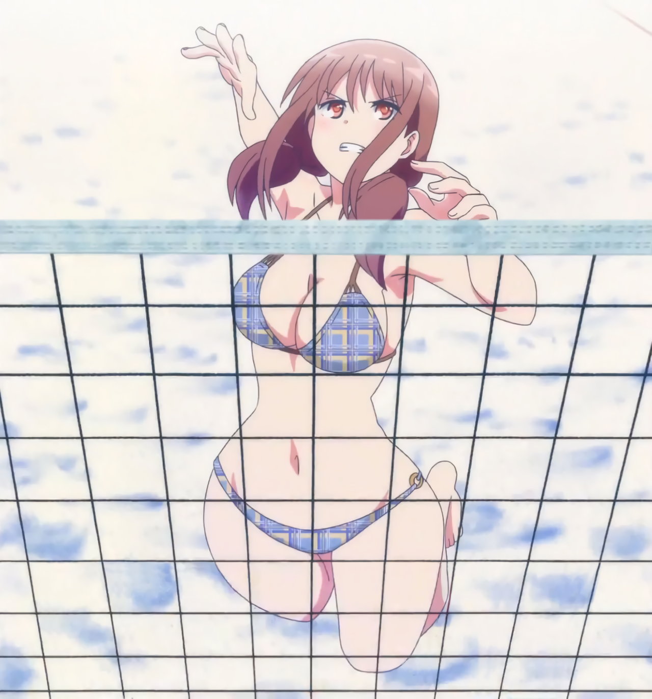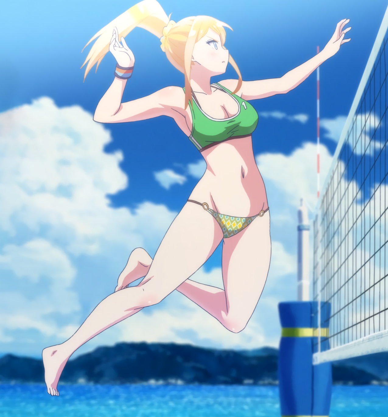 ビーチバレー試合中・水着姿の成美、彩紗、遥、かなた。