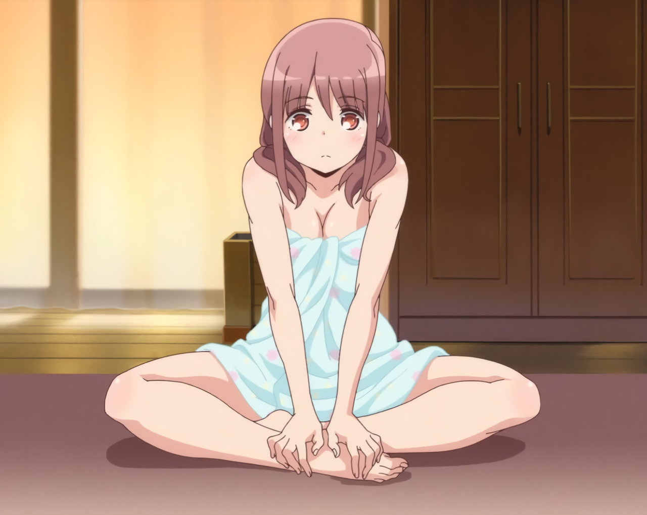 寝間着が開けて、胸谷間チラする遥。