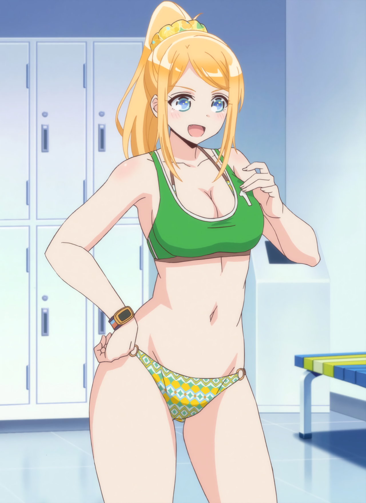 更衣室で水着を着用する、遥、かなた、紅愛、恵美理。