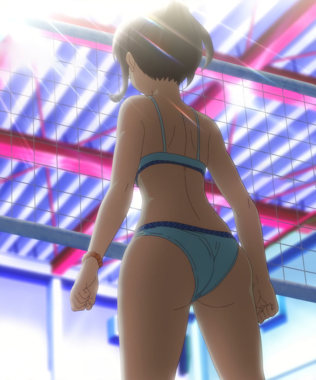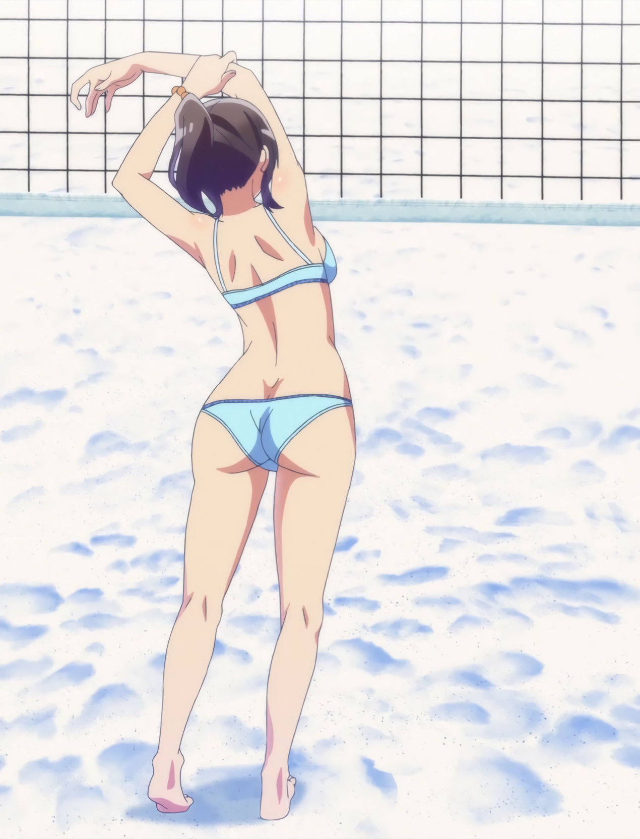 ビーチバレー試合中・水着姿の遥、かなた、成美、彩紗。