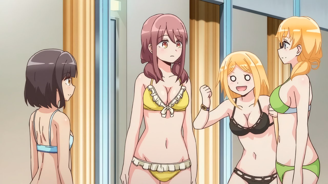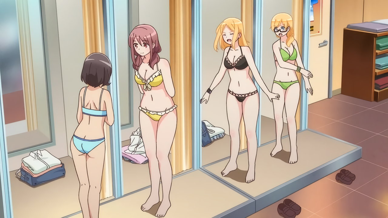 試着した水着姿を見せ合う、かなた、遥、紅愛、恵美理。