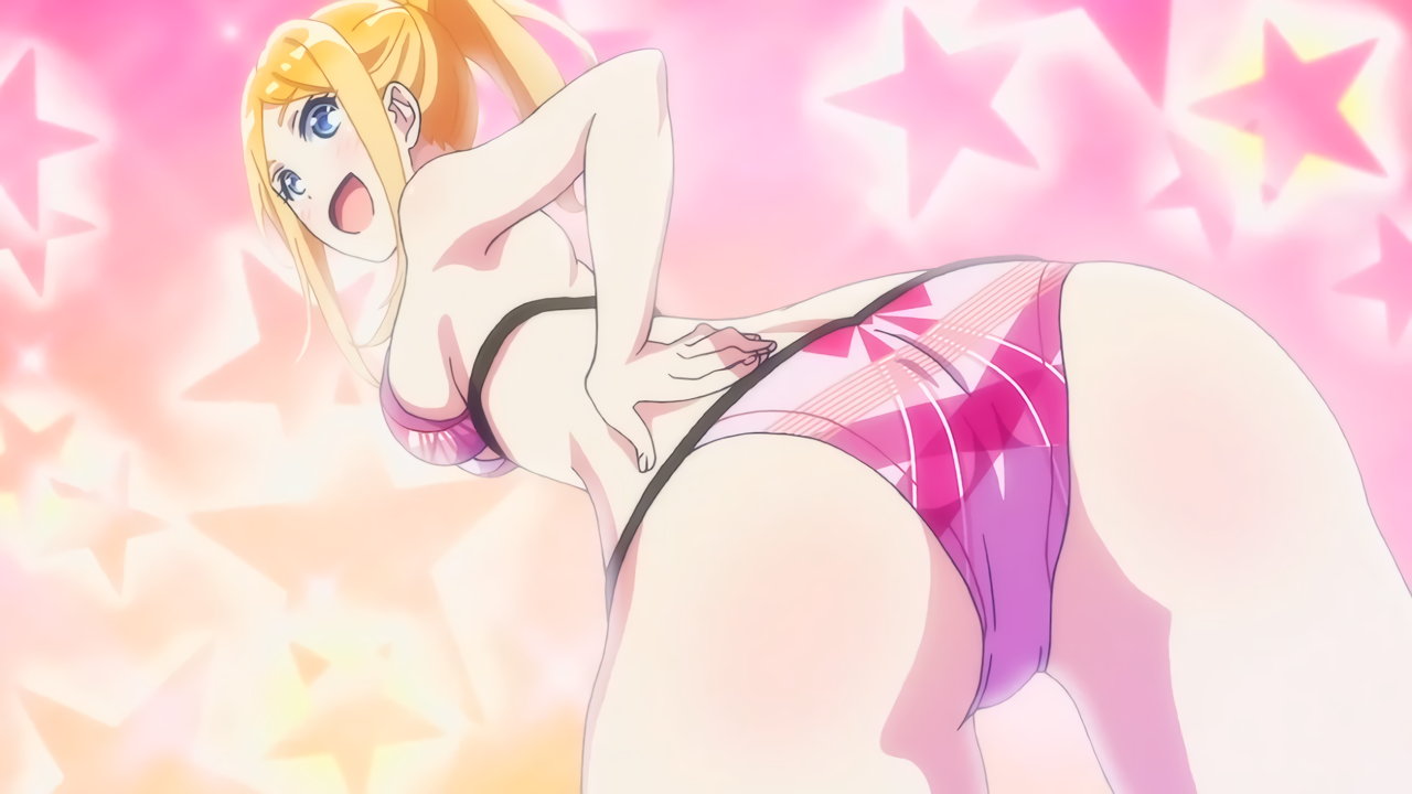 巨乳と尻を見せながら脱衣し、水着姿になる遥。