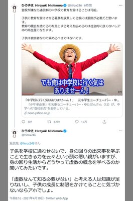 4月10日、2ちゃんねる創設者のひろゆきこと西村博之さんは『Yahoo!』に配信された上記記事にリンクを貼り