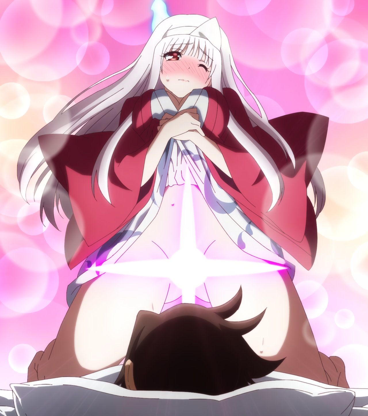 浴衣を捲り上げる幽奈。しかし何故かパンツが消えており、ノーパン生股間を御開帳してしまう。