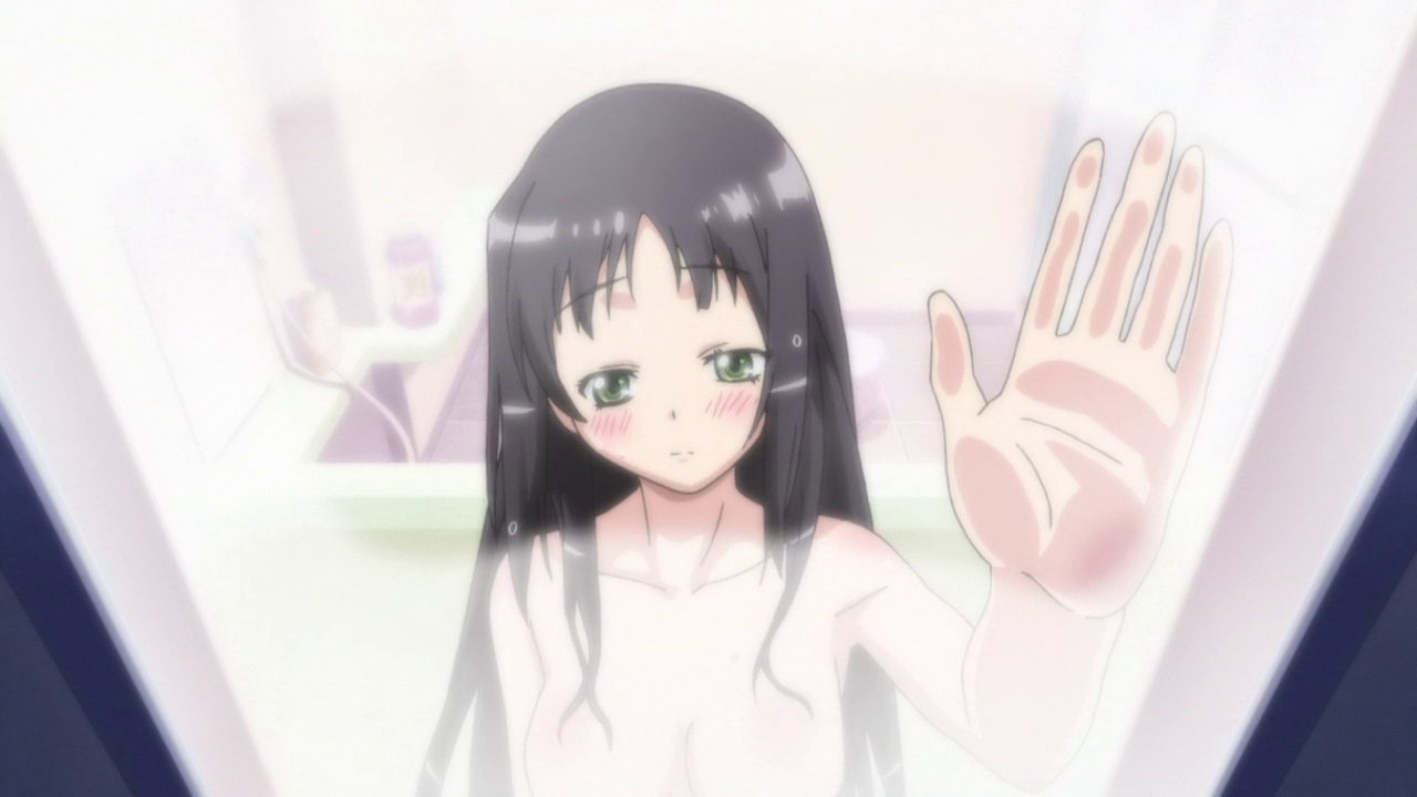 浴室の窓を手で拭く心乃枝。