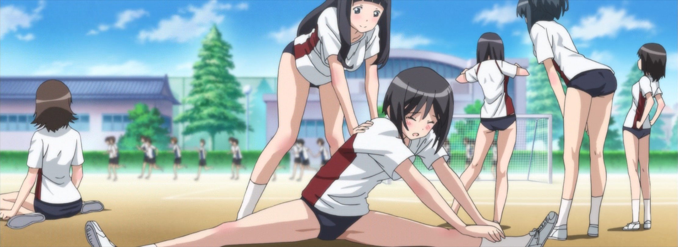 準備体操するブルマ体操着の女子生徒たち。