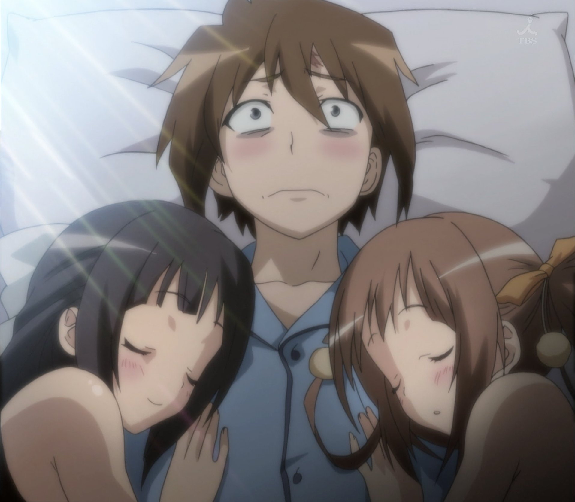 全裸の心乃枝と雅に挟まれて眠れない将悟。