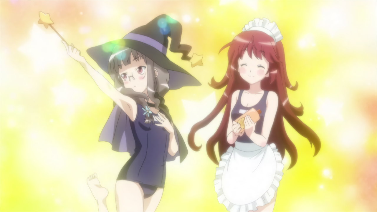 スク水エプロンの来実と、スク水魔女衣装の芽依。
