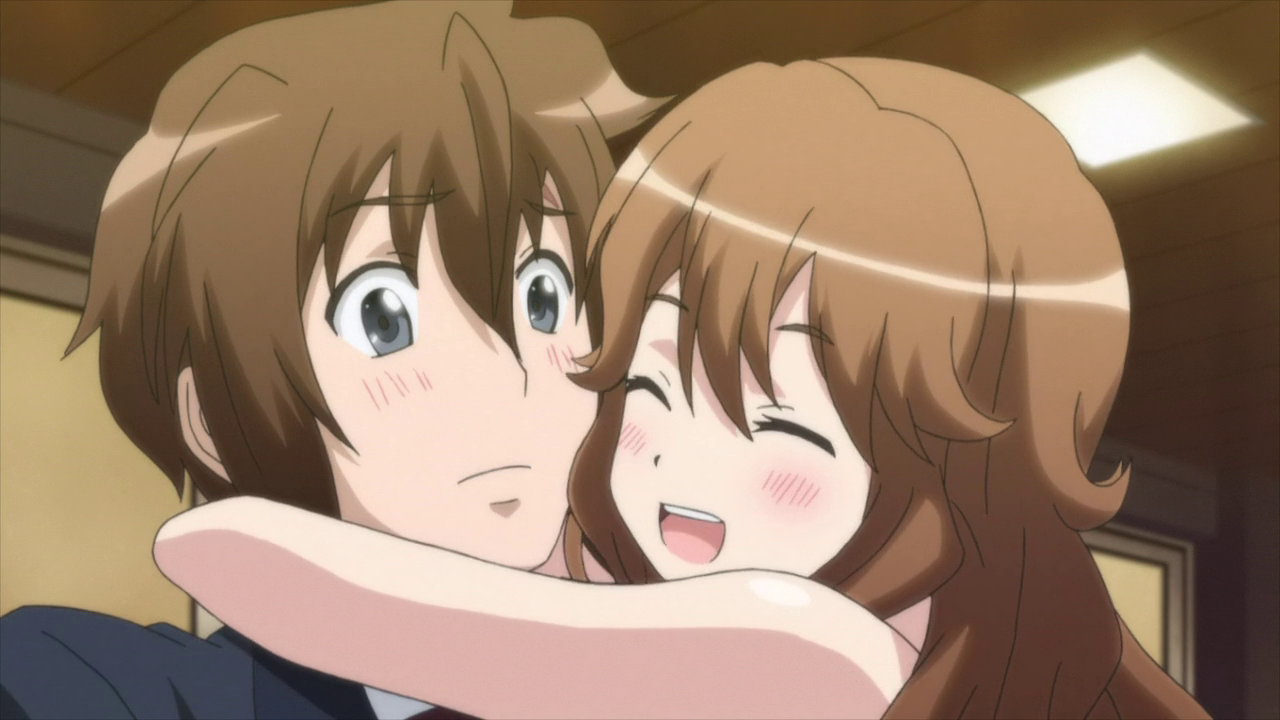 将悟に抱きつき、巨乳を押しつける愛菜。