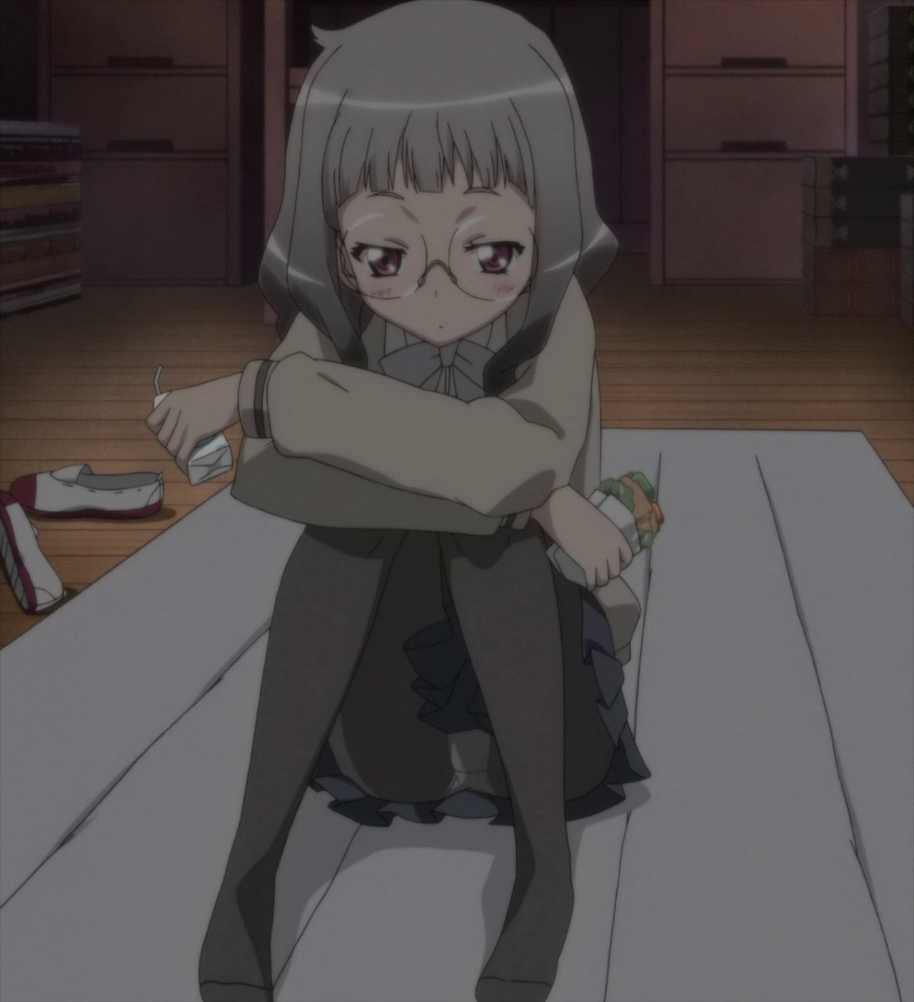 体育座りする芽衣のパンスト越しのパンチラ。