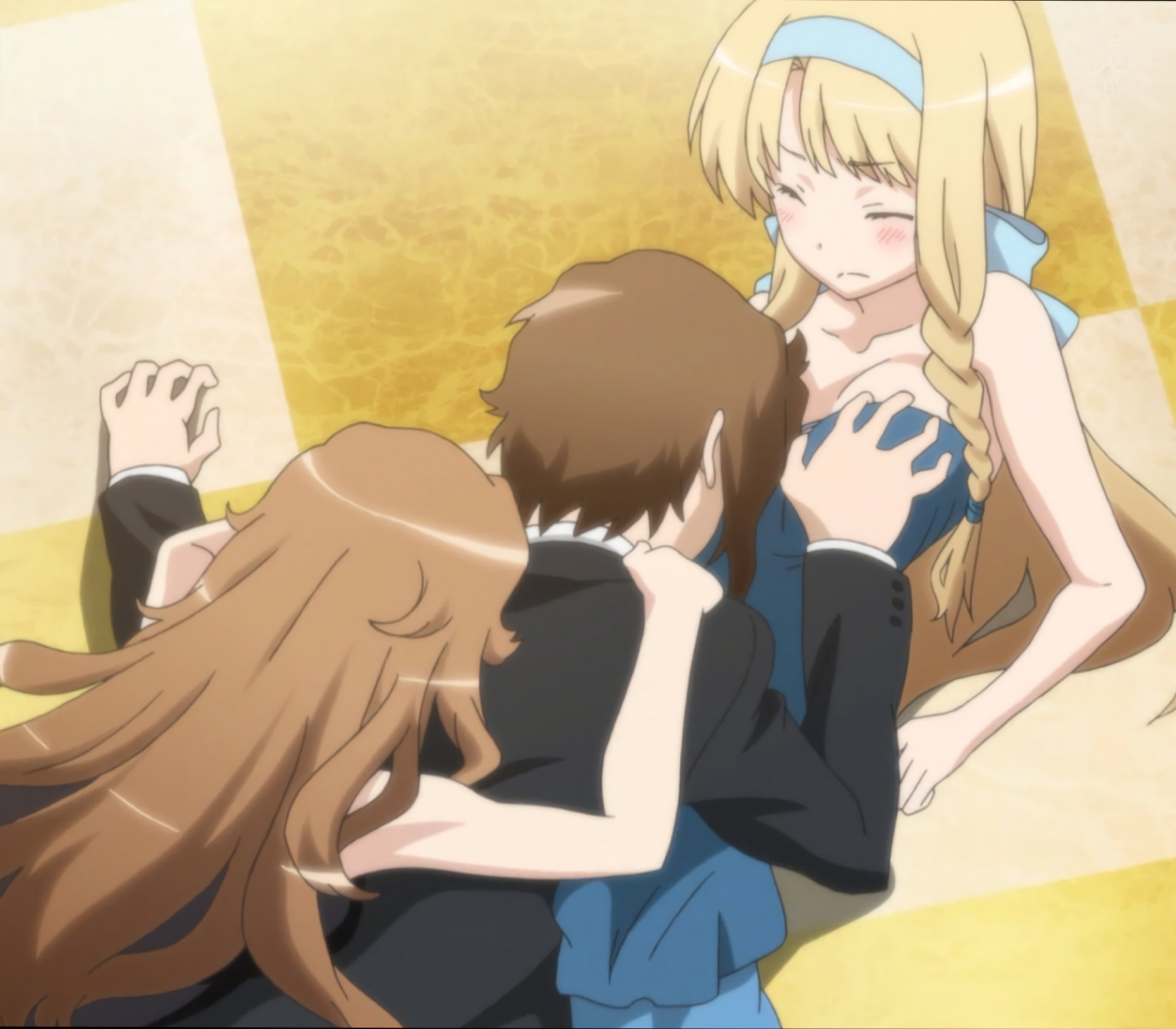 愛菜に抱きつかれた弾みで凛香を押し倒し、凛香の乳房を掴む将悟。
