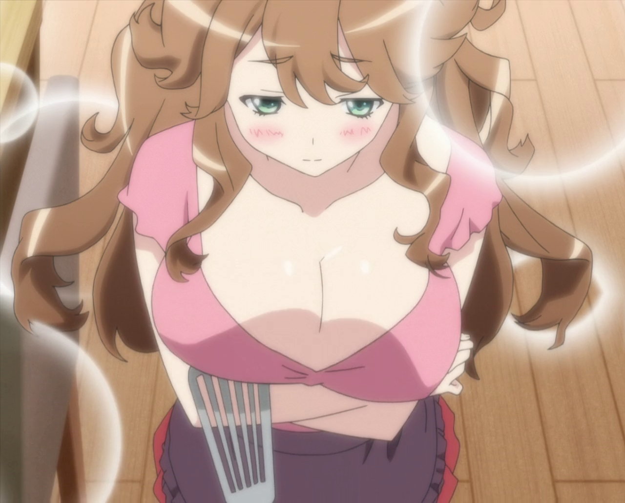 フライ返しで愛菜の巨乳を突く将悟。